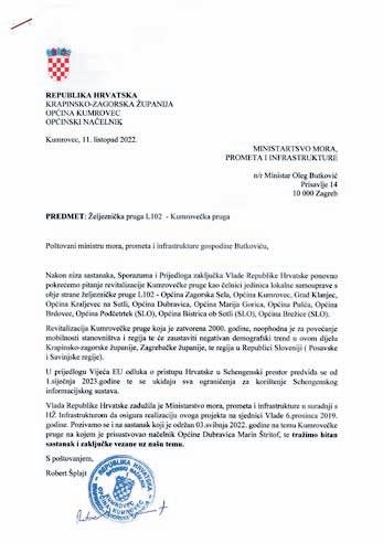Kako je rekao, od 2017. godine, kad se intenzivnije počelo govoriti o mogućem ulasku Hrvatske u Schengensko područje, Krapinsko – zagorska županija kontinuirano je na temu pruge slala dopise Ministarstvu prometa i Hrvatskim željeznicama. –Kako se najavljivao ulazak u Schengen, mi smo i 2018., i 2019., i 2020., i 2021. i sada 2022. godine pisali ministru Butkoviću i HŽ-u, pozivajući ih da u financijski plan i plan izgradnje infrastrukture za iduću godinu stave i Kumrovečku prugu. Nažalost, ni jedne godine se to nije dogodilo. U međuvremenu je bilo i zajedničkih inicijativa Zagrebačke i Krapinsko – zagorske županije, pa je bilo i naše zajedničke inicijative s općinama i gradovima uz Sutlu, bez obzira na stranačku pripadnost. Bilo je i niz aktivnosti koje su gradovi i općine poduzimali sami, ali smo uvijek svi bili u kontinuitetu i uvijek s istim ciljem, a to je da se Kumrovečka pruga stavi u funkciju. Jer možete primije-