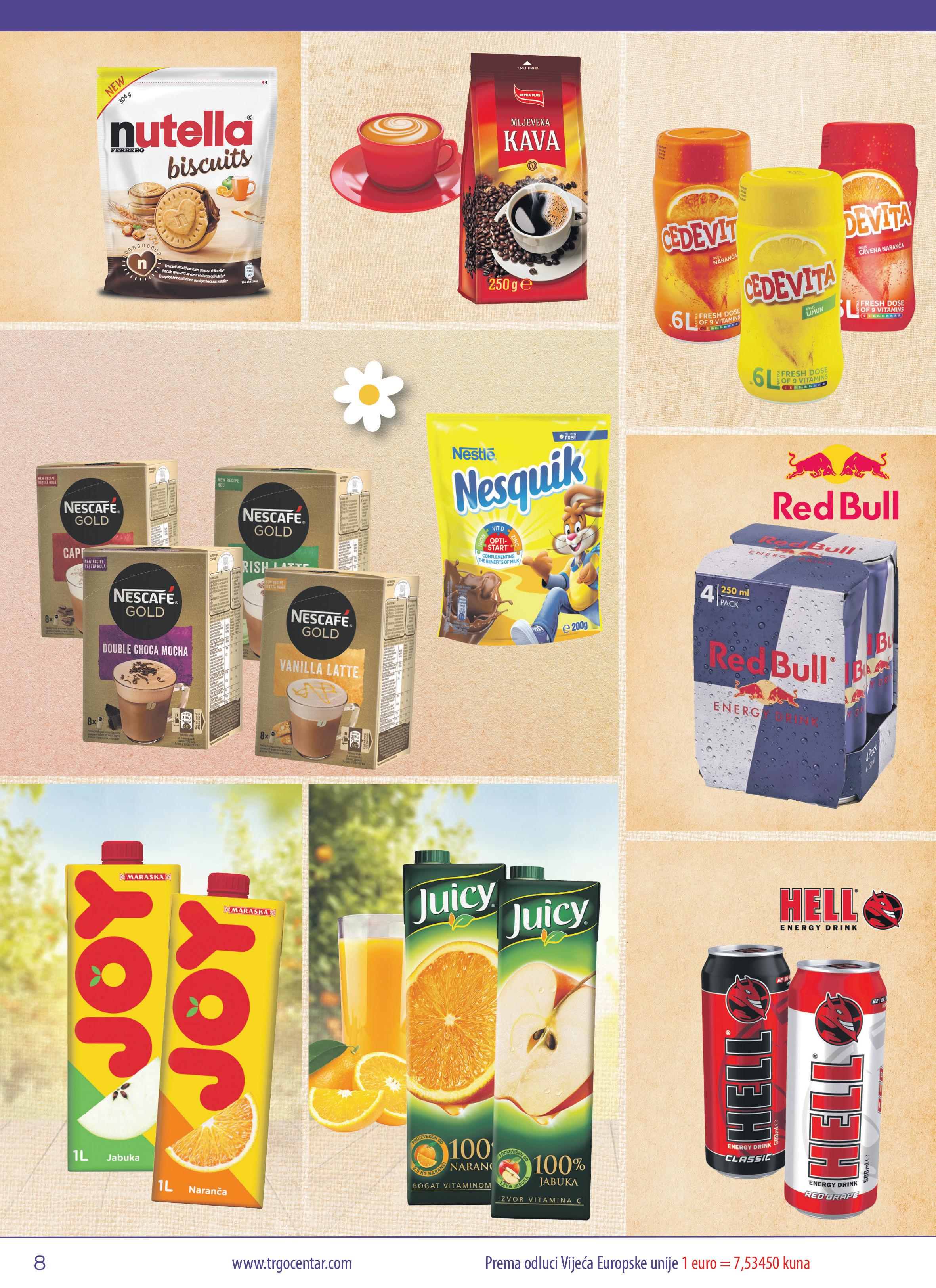 79 1 EUR 13.49 kn -25% 2.39 EUR*/ 18.01 kn* Mljevena kava Ultra plus, 250 g Keksi Biscuits Nutella 304 g 35 3 EUR 25.24 kn -17% 4.04 EUR*/ 30.44 kn* 99 2 EUR 22.53 kn -25% 3.99 EUR*/ 30.06 kn* 89 1 EUR 14.24 kn -23% 2.48 EUR*/ 18.69 kn* Instant cappuccino (razne vrste) Nescafe Gold Iced Cappuccino, 108, 5 g Gold Cappuccino, 112 g Mocha ili Gold vanilija Latte, 148 g Gold Irish Latte, 176 g Instant kakao prah Nesquik, 200 g 69 3 EUR 27.80 kn -15% 4.35 EUR*/ 32.78 kn* Vitaminski napitak naranča, limun ili crvena naranča Cedevita, 455 g 89 0 EUR 6.71 kn -21% 1.13 EUR*/ 8.51 kn* 69 1 EUR 12.73 kn -22% 2.19 EUR*/ 16.50 kn* Negazirano piće naranča ili jabuka Joy, 1 l Negazirano piće naranča ili jabuka 100% Juicy, 1 l 19 1 EUR 8.97 kn -25% 1.59 EUR*/ 11.98 kn* 64 4 EUR 34.96 kn -25% 6.24 EUR*/ 47.02 kn* Energy drink ili Red grape Hell, 500 ml Energetsko piće Red Bull 4 x 0,25 l