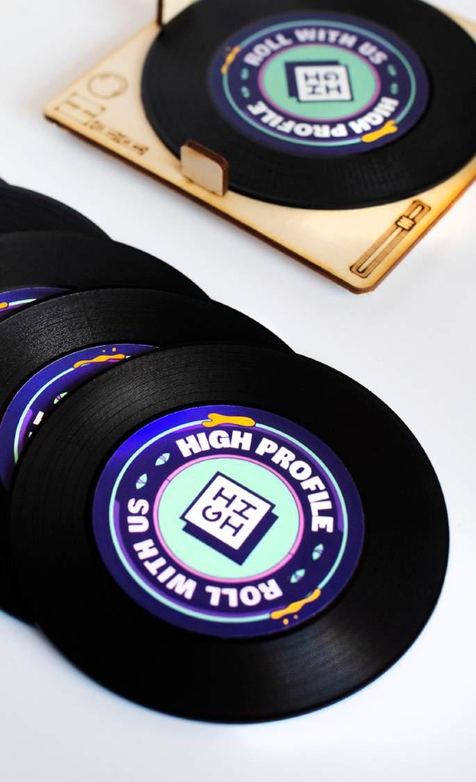 Create your own box set of greatest hits with these one-of-a-kind Turntable Coaster Holders! Made from laser cut plywood that features a movable tone arm, these coaster sets are a totally unique way to showcase your brand. Packaged in a crystal clear soft-fold box with 6 coasters, this Turntable Coaster Holder is a rockin' way to maximize brand recognition.