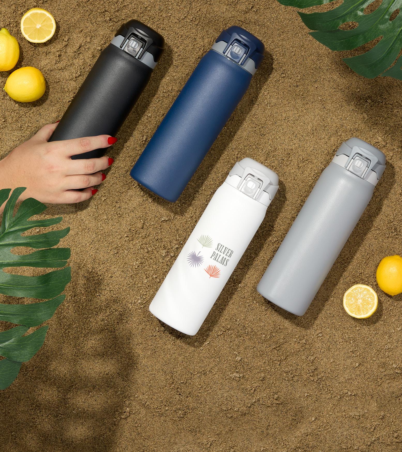 ■ Flip Straw cap features a flow valve, covered mouthpiece and soft pivoting handle