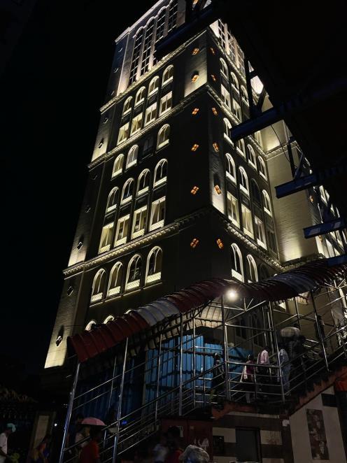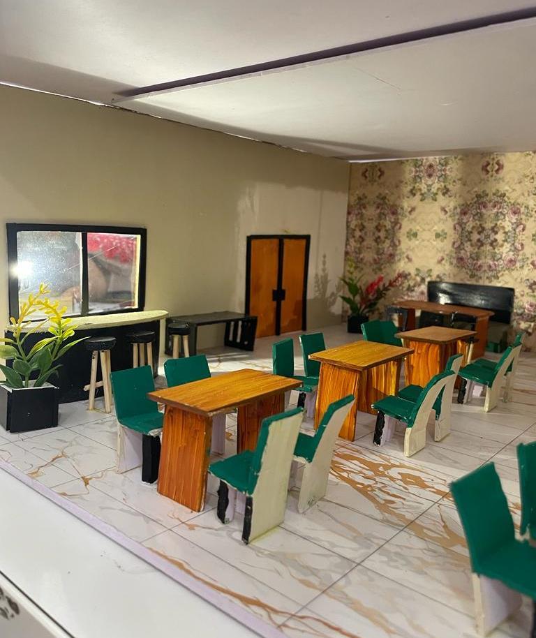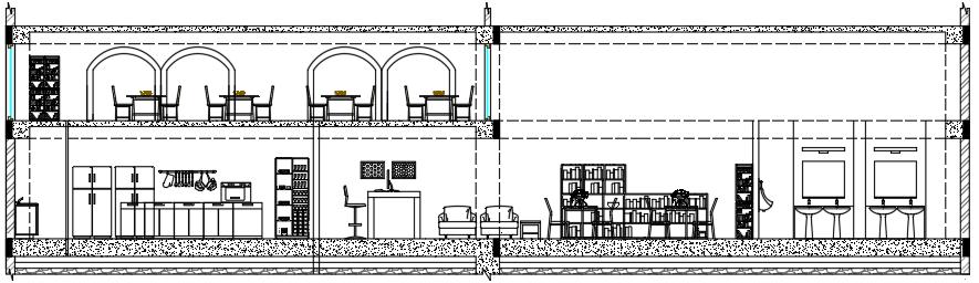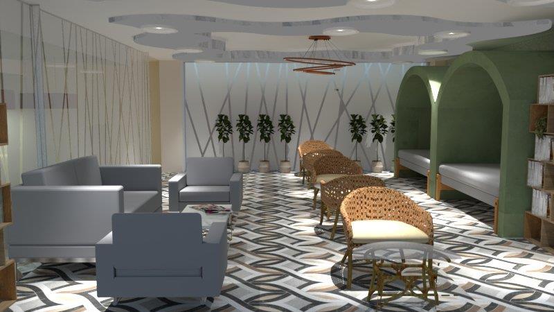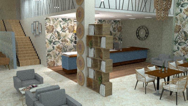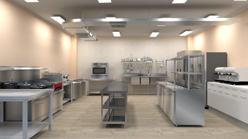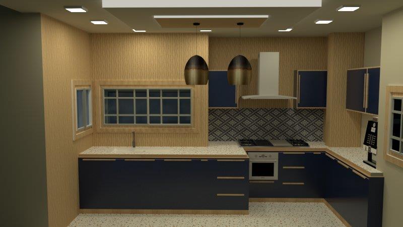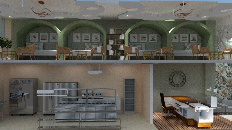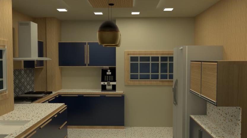 This is the book café kitchen. Beige, brown colour is used. Panel lights are used