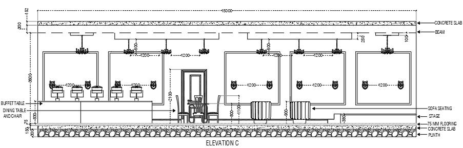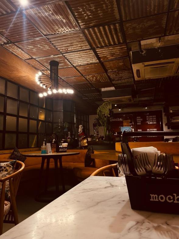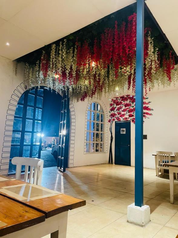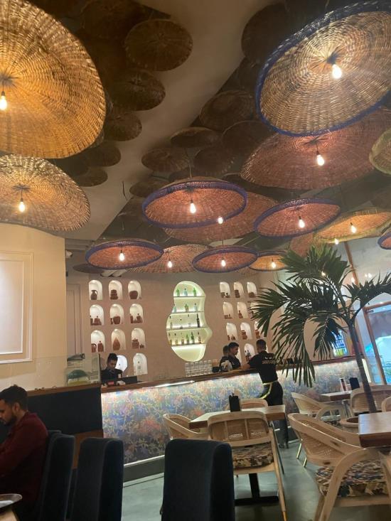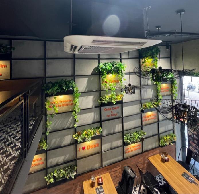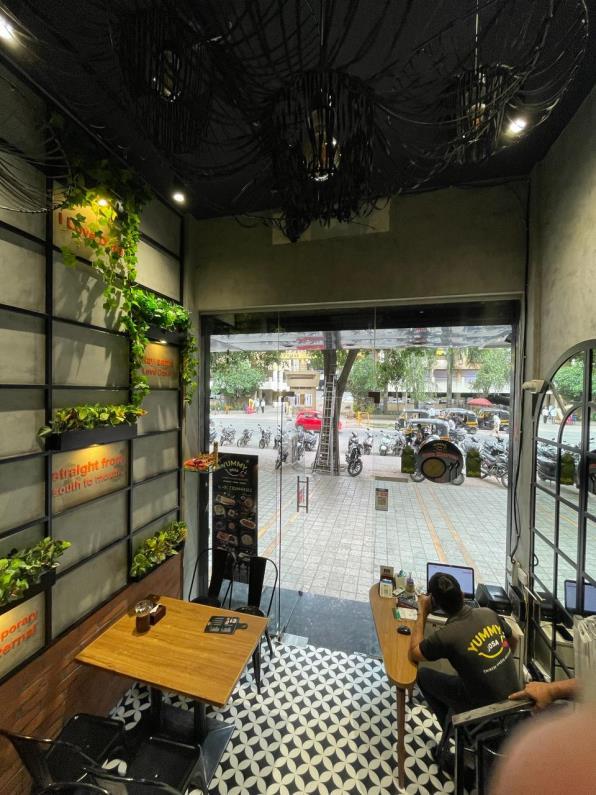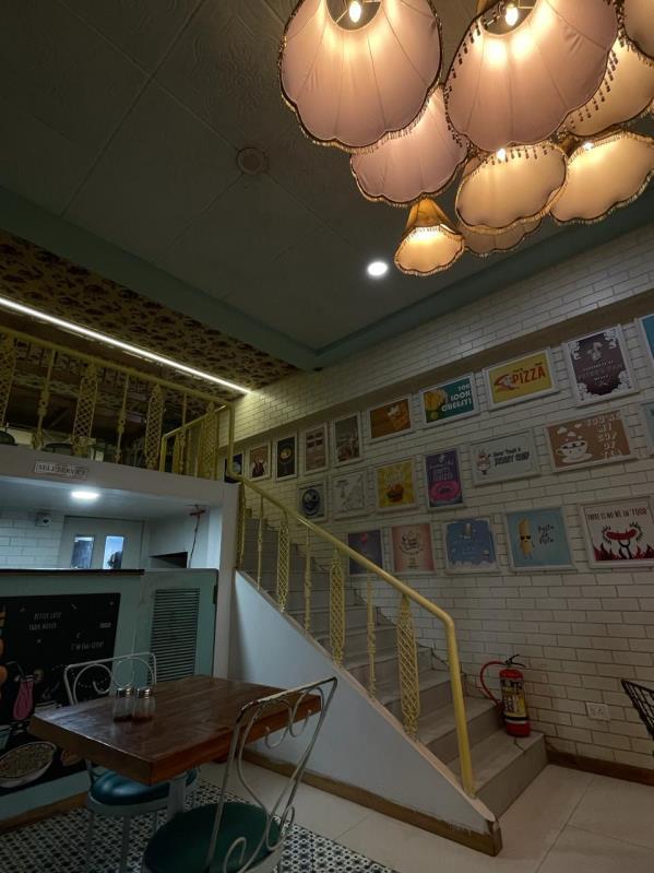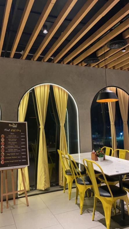 Arch seating is given in the mezzanine floor, the floor has curve POP ceiling. Since, the theme is natural earthy element cane material is used in the chair. Frosted glass is used throughout the café.