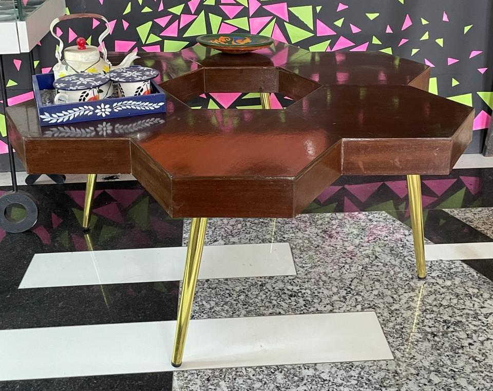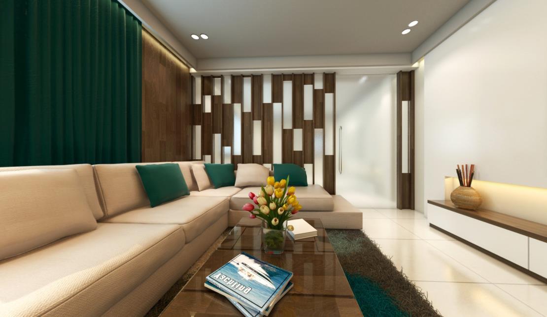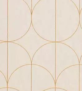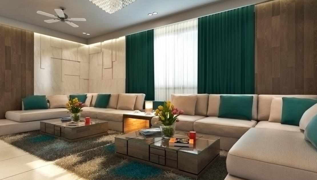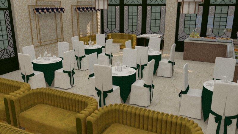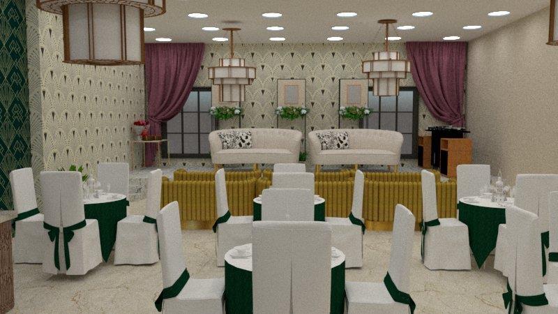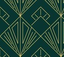 Art Deco Theme is followed, Mustard velvet sofa, with circular dining table giving hint of bottle green colour. Art deco wallpaper is used and buffet tables has fluted panels.