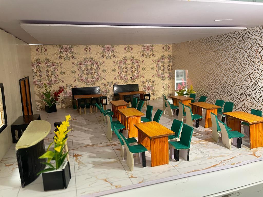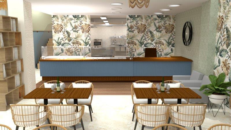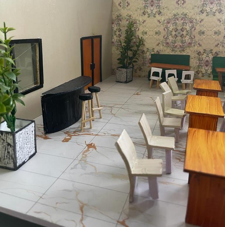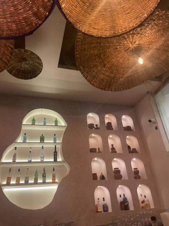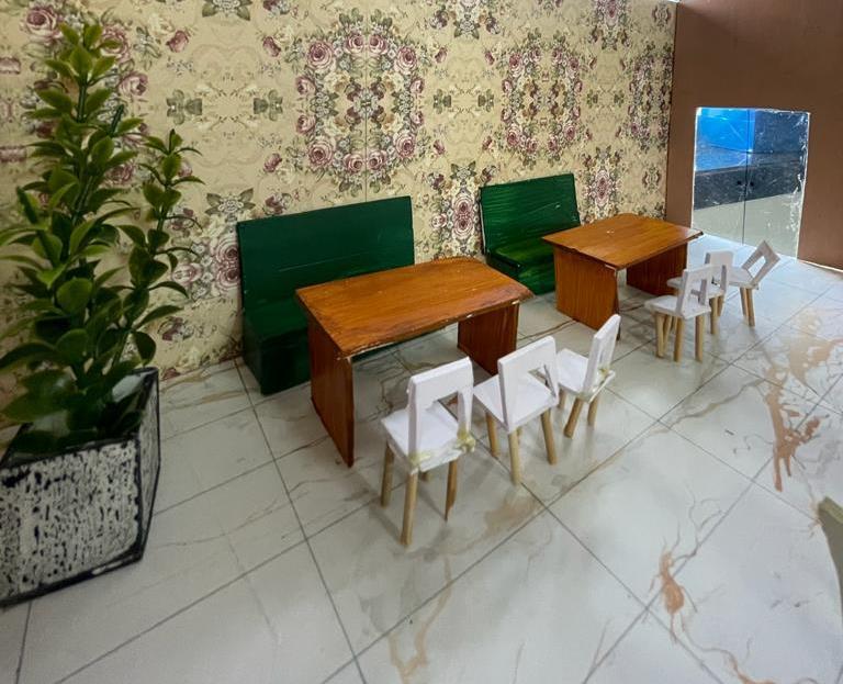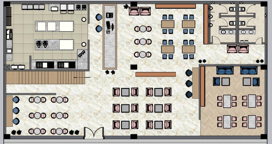 Since, the overall theme is art deco the wallpapers and flooring are kept accordingly. Arches are primarily used in the shelves and in the window design. Bill counter is made up of wood and has curved edge.