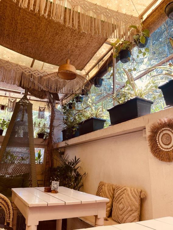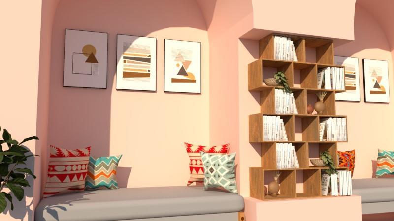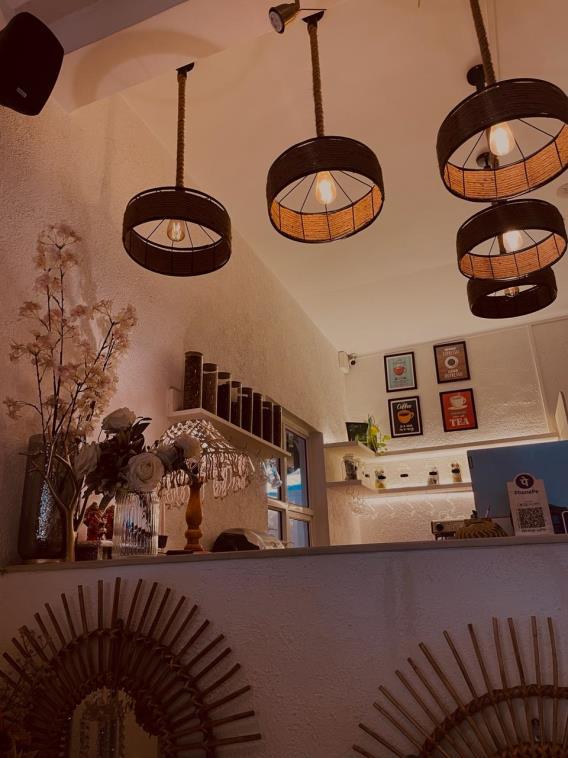 The interior is a harmonious blend of earthy tones, with warm browns and soft greens dominating the color palette. Sunlight filters through large windows, Floral wallpaper is used in the wall and it is furnished with comfortable cane chairs and big armchairs making it suitable to curl up with a good book.
