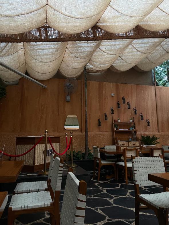 Natural materials are used to bring out the earthy theme, jute and oak wood is primarily used. Floral Wallpaper is used to bring out the nature.