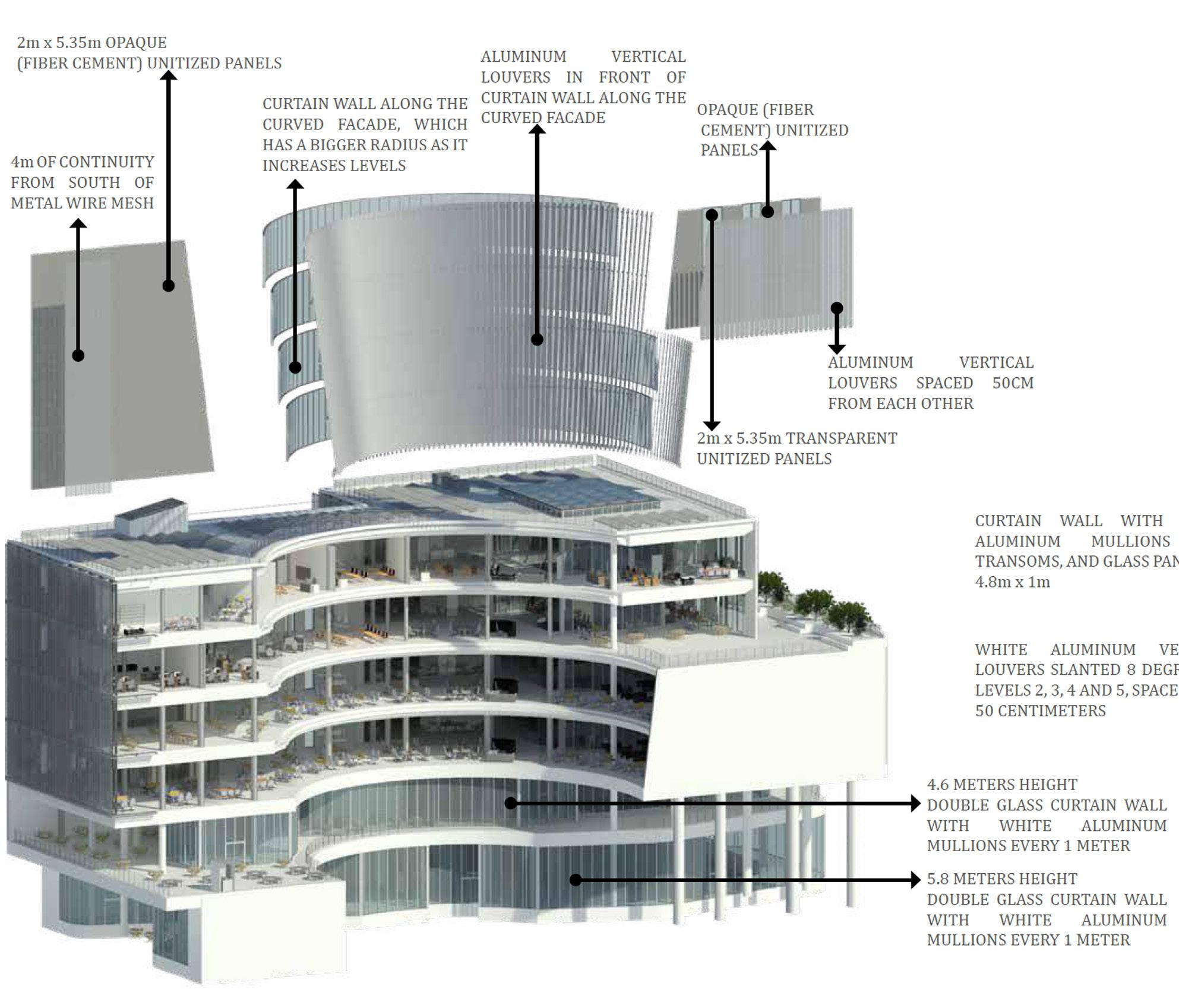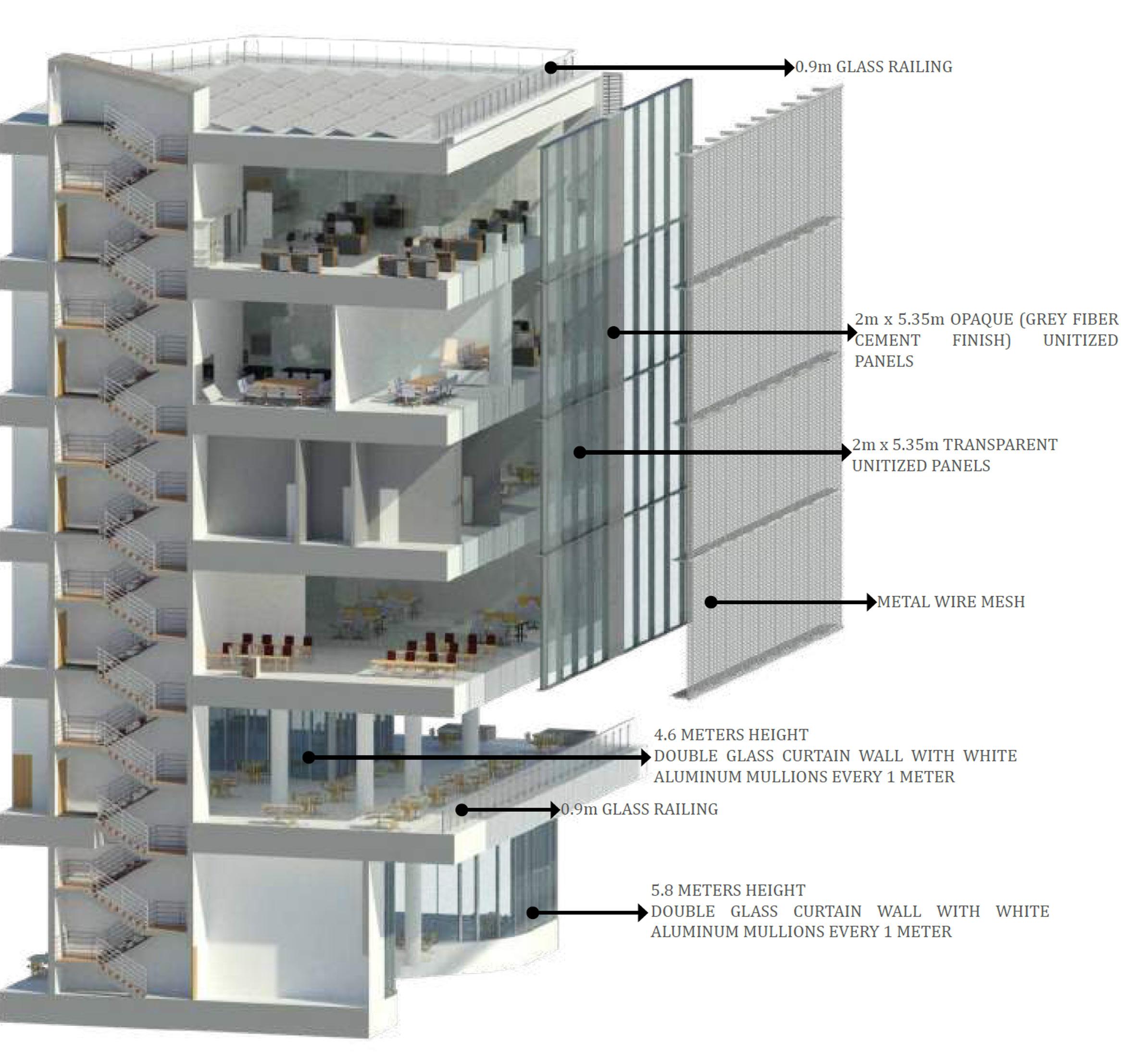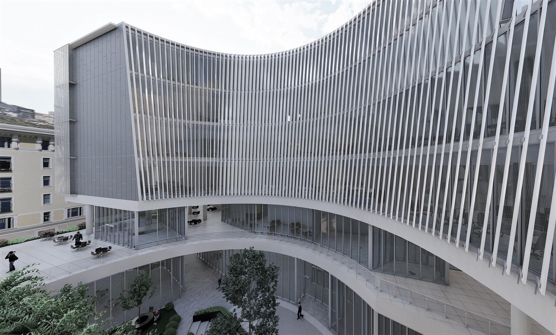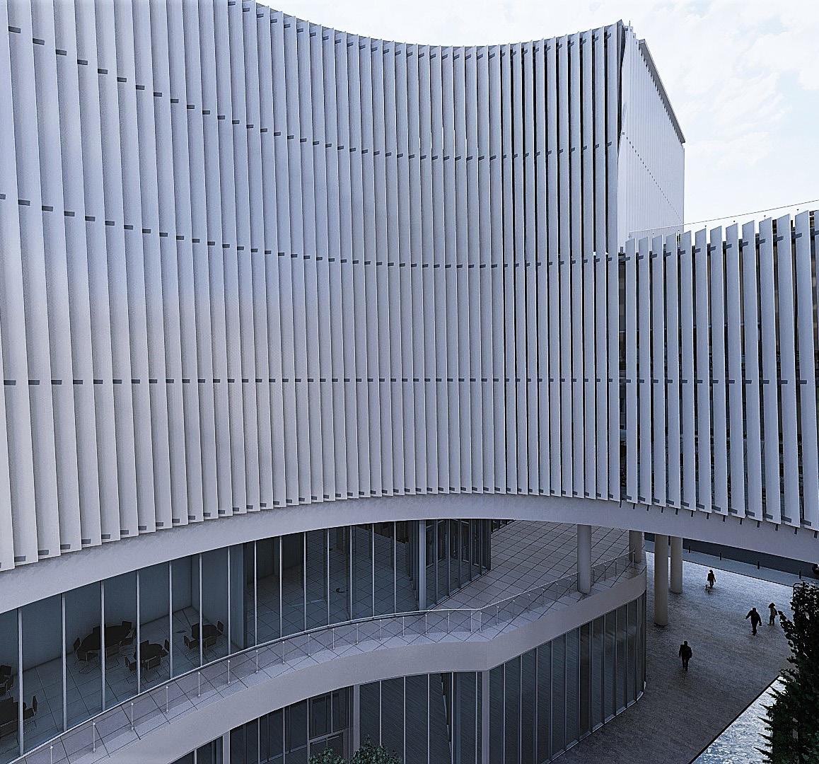 Transformation: The original facade of Building 3 is transformed into a curtain wall