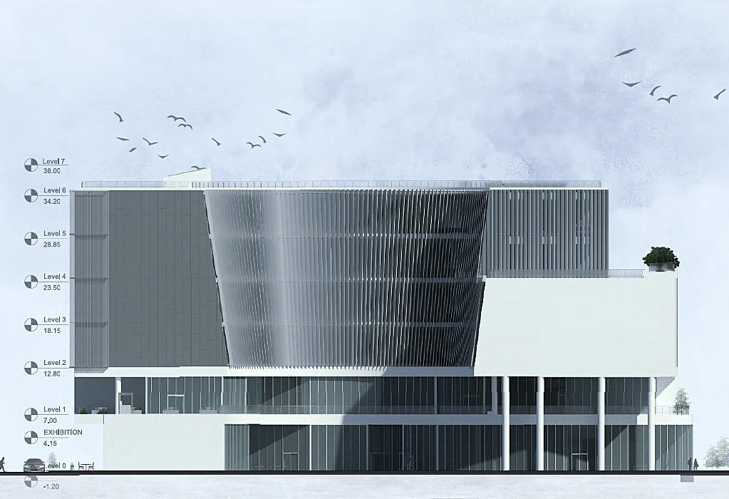 The building’s design integrates visual connections between internal and external spaces through a transparent facade, linking the courtyard with the street. The atrium enhances vertical movement, connecting the courtyard with dynamic visual lines.