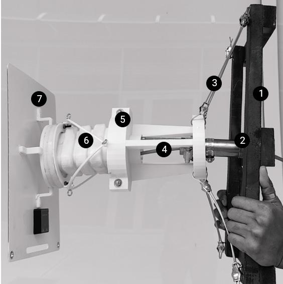 3. Steel no hub coupling 73 mmø 4. Cable connector 5. Combined cable 1. 10mm thick, 100mm long steel support legs 2. 2mm thick aluminum universal joint with aluminium plate