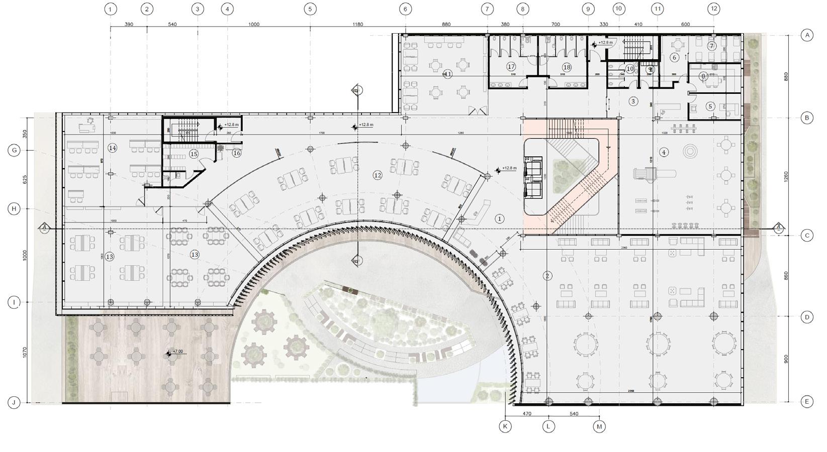 The ground floor courtyard serves as the site’s focal point, providing a stopping point between A and B, and offering a relaxing or meeting space. It also introduces greenery, enhancing the site’s natural feel and promoting a sustainable mindset.