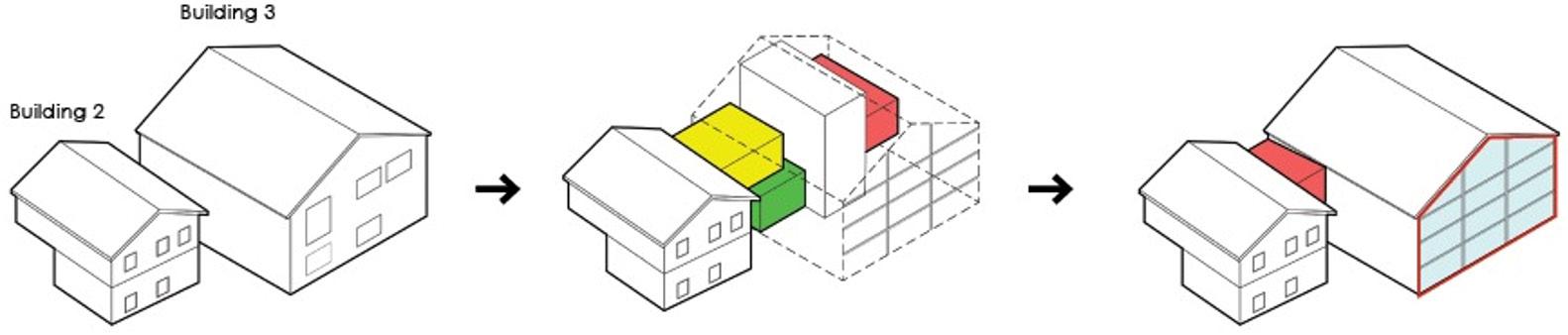 Addition (Internal + External): Boxes are added to the buildings to introduce new functions.