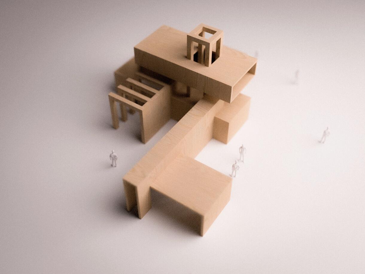 Komposisi utama terdiri dari susunan massa persegi panjang terpisah yang diorientasikan menghadap utara sebagai respon tapak, disusun mengikuti tiga arah sumbu tertentu Massa - massa ini dihubungkan denganareatransisi.