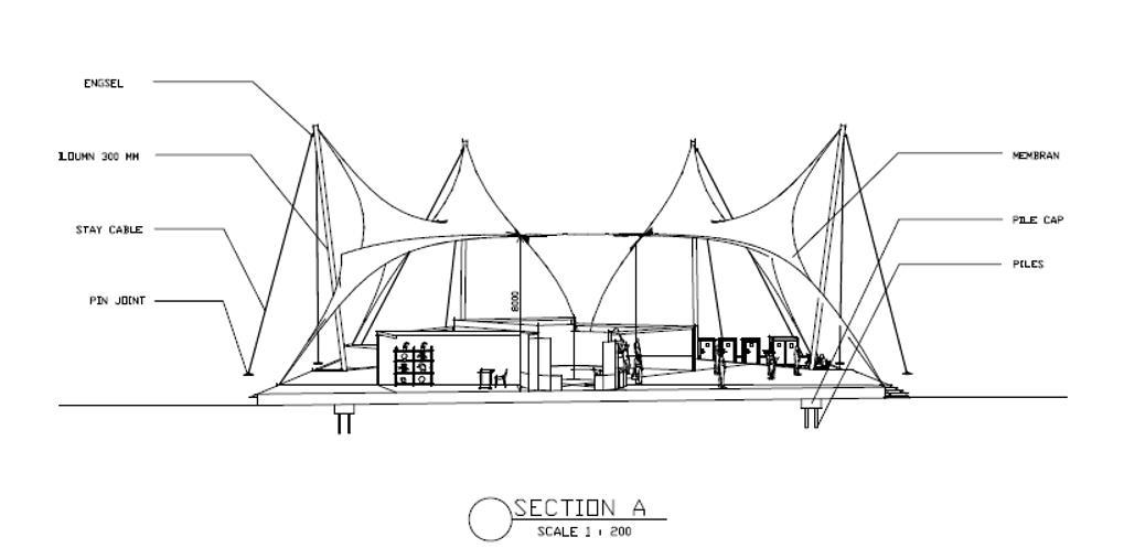 Designing a structural system that is used for exhibition activities and buying and selling flora and fauna This building is located in the central Jakarta city business district complex, namely Lapangan Banteng Floor Plan and Roof Plan The system structure that used is pilecap foundation, stay cable, coloumn it can be the main structure