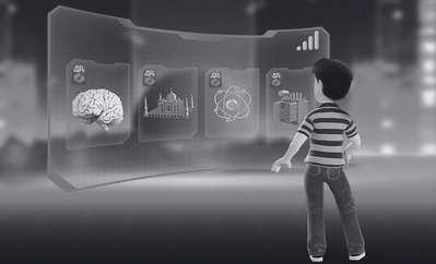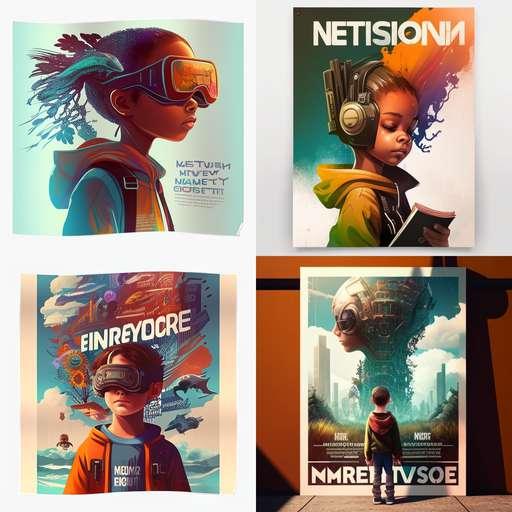 BUILT ENVIRONMENT IN METAVERSE FREEDOM IN METAVERSE EDUCATION IN METAVERSE SOCIAL INTERACTION IN METAVERSE 20 | CHAPTER 4: POSTER images generated by Midjourney Futuristic Style Bright and Bold Colours Gradients Books Interactive Digitalise