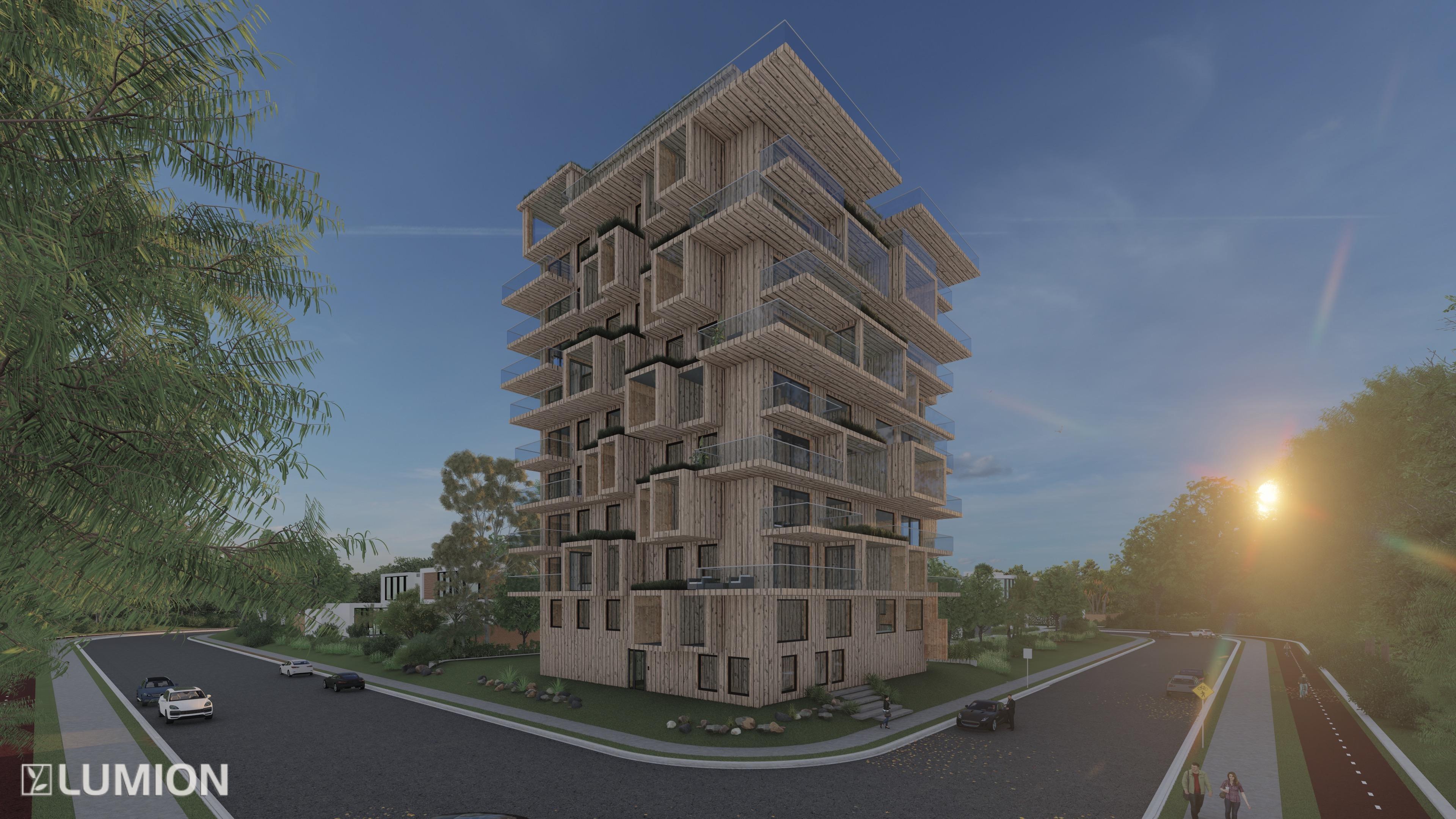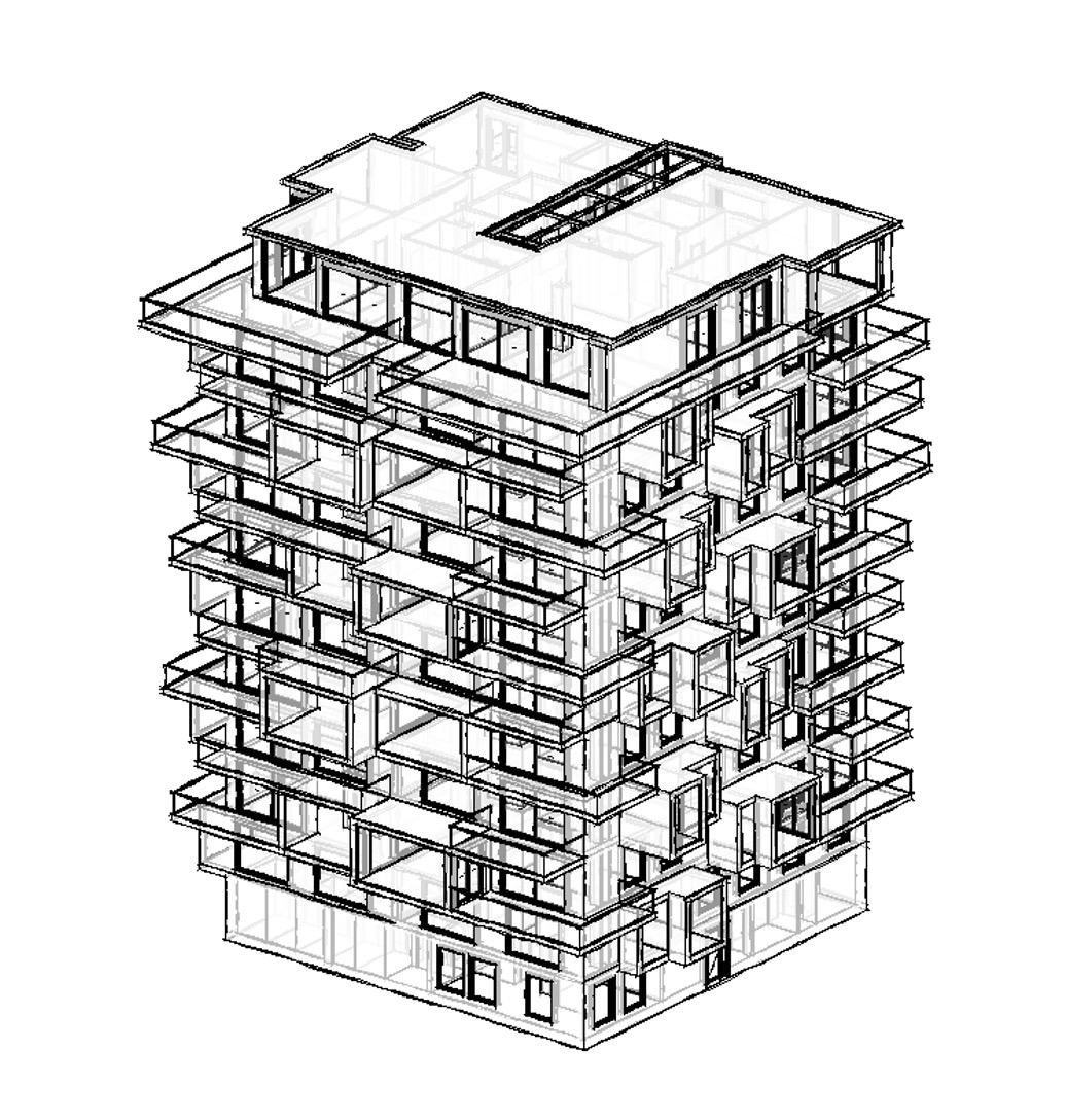 Byggnaden planeras som ett 10våningshus med större lägenheter, takvåningar och takterrasser Den följer definitionen av ett svenskt punkthus eller tornhus med en enkel ingång till den centrala hissen och trapphuset, som planeras med en sluss till garaget samt innergård från bottenvåningen Planeringen innebär minst fyra lägenheter per våning med en balanserad mix av 2Rok, 3Rok och 4Rok. På entréplanet byggs en gästlägenhet med 1Rok Entréplanet kommer att planeras med blandade ytor för både lagring och kommersiellt bruk.