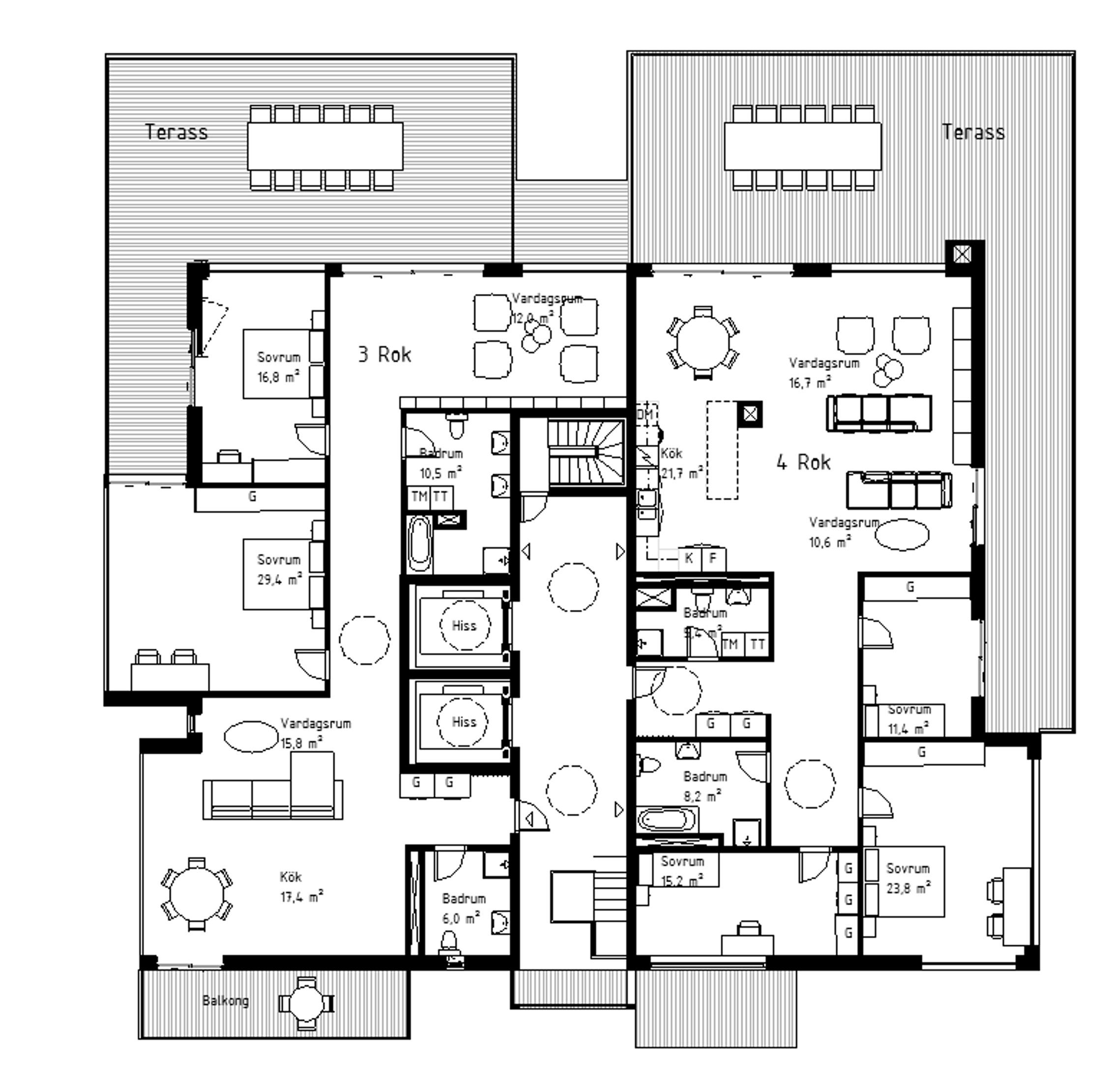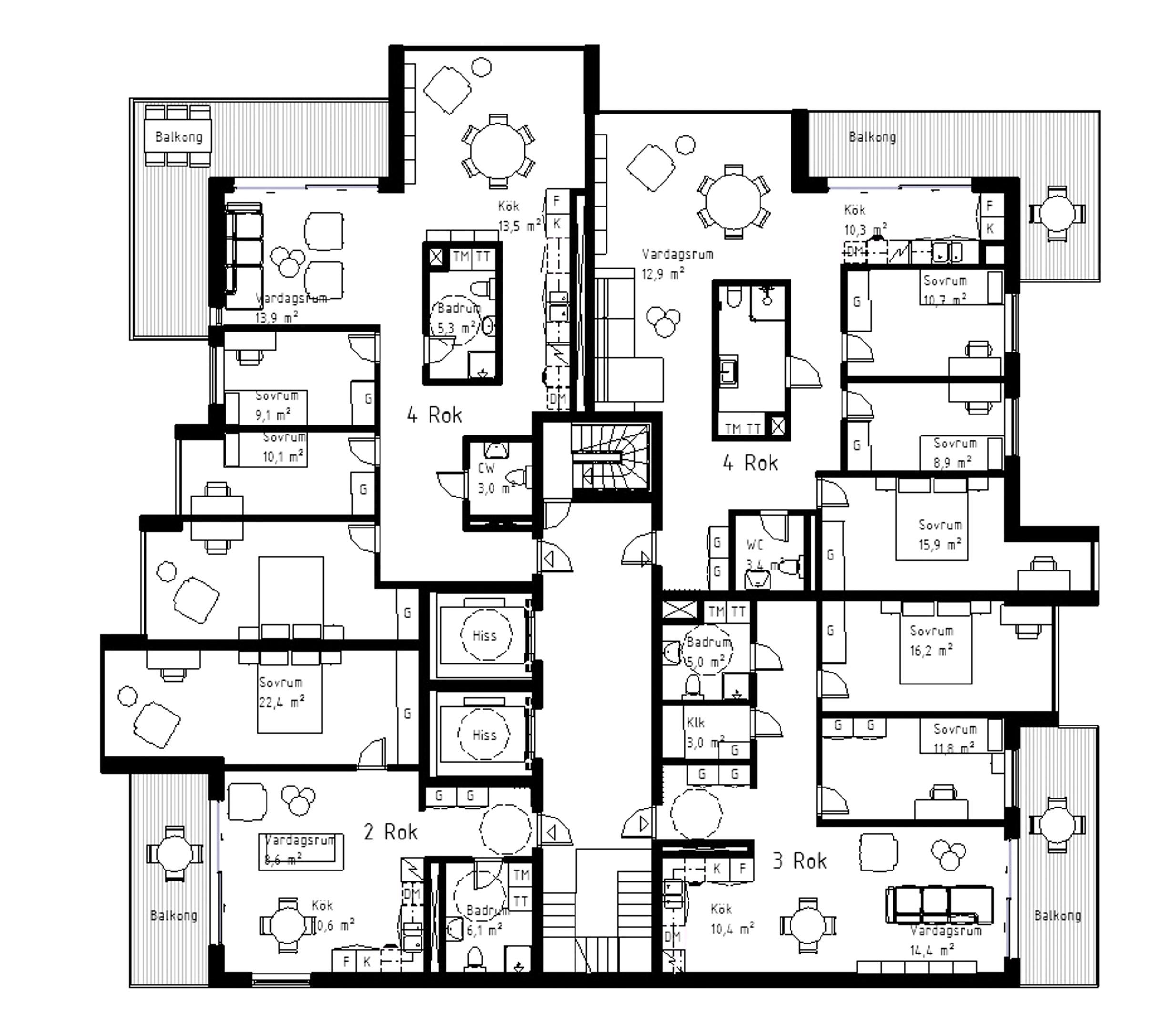 Detta redovisar våning 4 med fyra lägenheter med tillhörande balkong