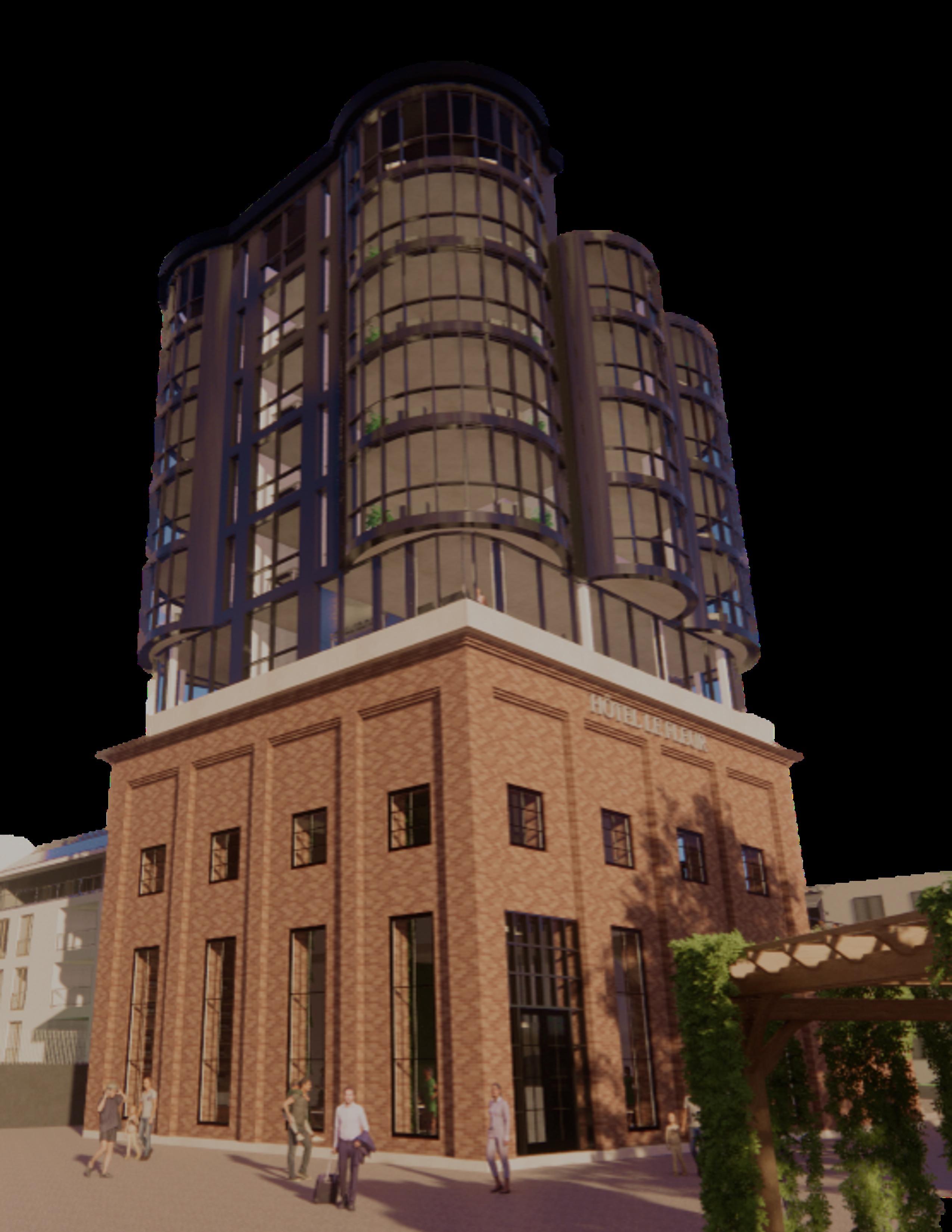 Med fokus på att hedra panncentralens historia kommer den tidstypiska fasaden att stå i centrum på nedre plan. Genom att sedan kontrastera med en tillbyggnad täckt i svart plåtfasad ger man byggnaden ett modernt och lyxigt utseende. Grönska tillförs som en varmare och mjukare kontrast till fasadens något mer kalla utseende, vilket skapar en harmonisk balans