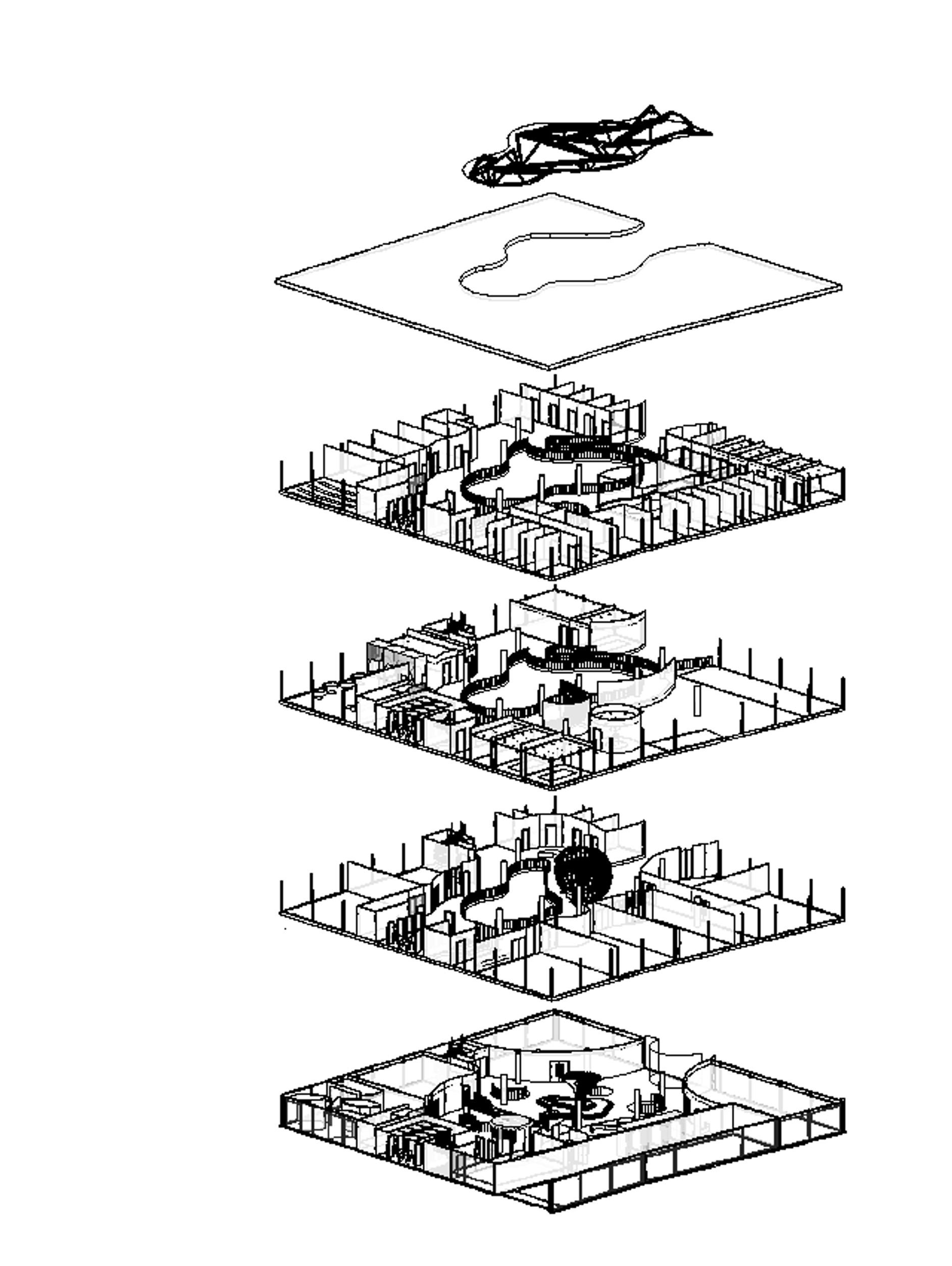 De organiska formerna ger en lekfull och krea1v miljö i hela byggnaden och bidrar även 1ll a9 ljudisolera de olika rummen, e;ersom plana ytor tenderar a9 skapa eko. Andra våningen, som är för skolan, har mer privat utrymme för lärande och utbildning för a9 skapa en lugn och tyst miljö Den inglasade innergården ger en öppen och lä9 känsla på golvet som relaterar 1ll en bro för interak1on. Våningen nås med två hissar och en stor trappa.