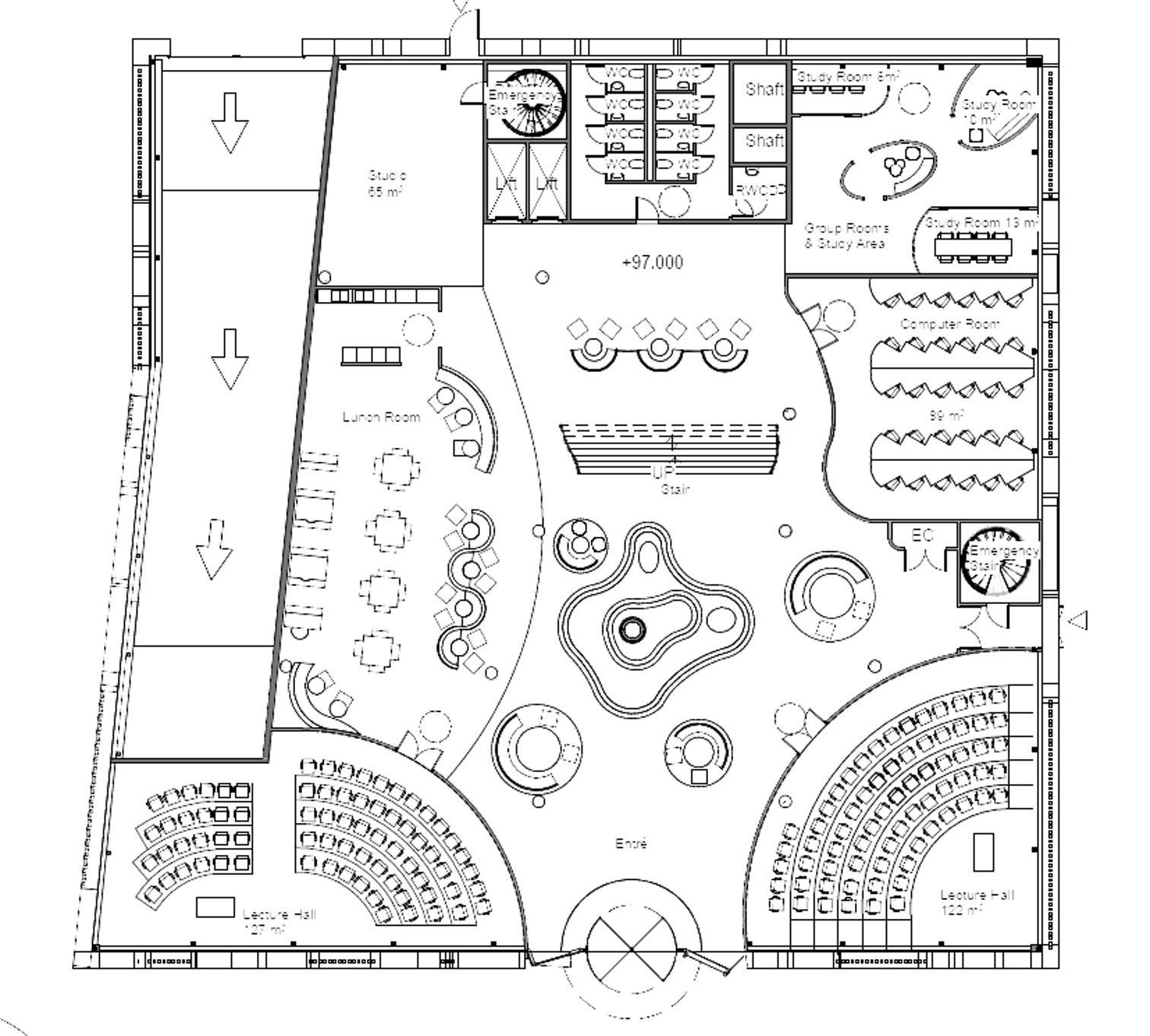 Byggnadens utformning planerades med valfria funktioner för våningarna och ytorna. På första entréplan är ytan mer öppen för interaktion och kreativitet för studenter. En stor yta för sociala aktiviteter finns på första våningen som levererar dagsljus och aktivitet genom de stora takfönstren. Designen är mycket transparent med en inglasad entré som ger en inblick i inomhusaktiviteter och gör byggnaden inbjudande för besökare.