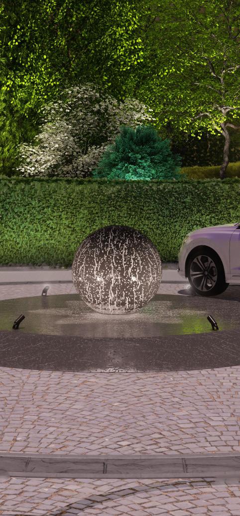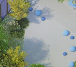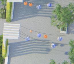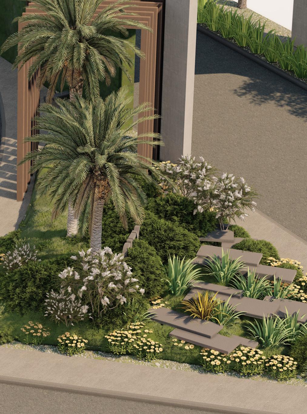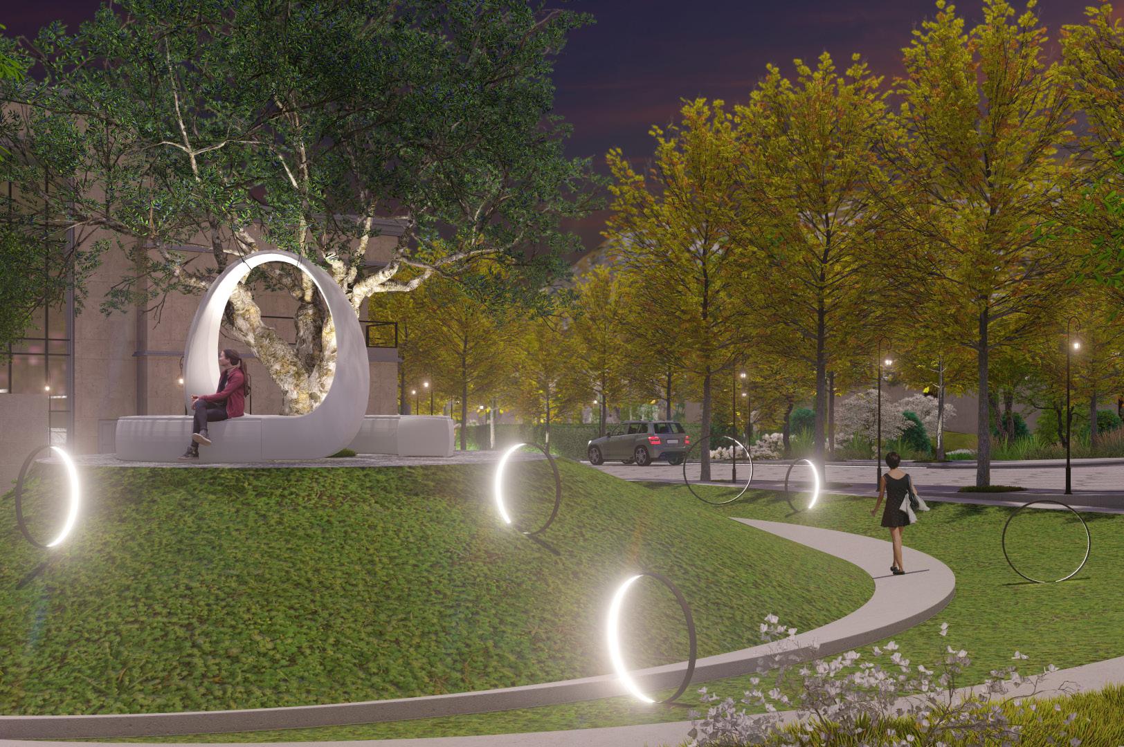 To complement the cool tones, we introduced an accent color “orange” strategically placed to enhance the overall aesthetic. The orange accents appear in a focal point in the light sculptures, adding warmth and contrast to the predominantly blue hardscape.