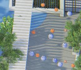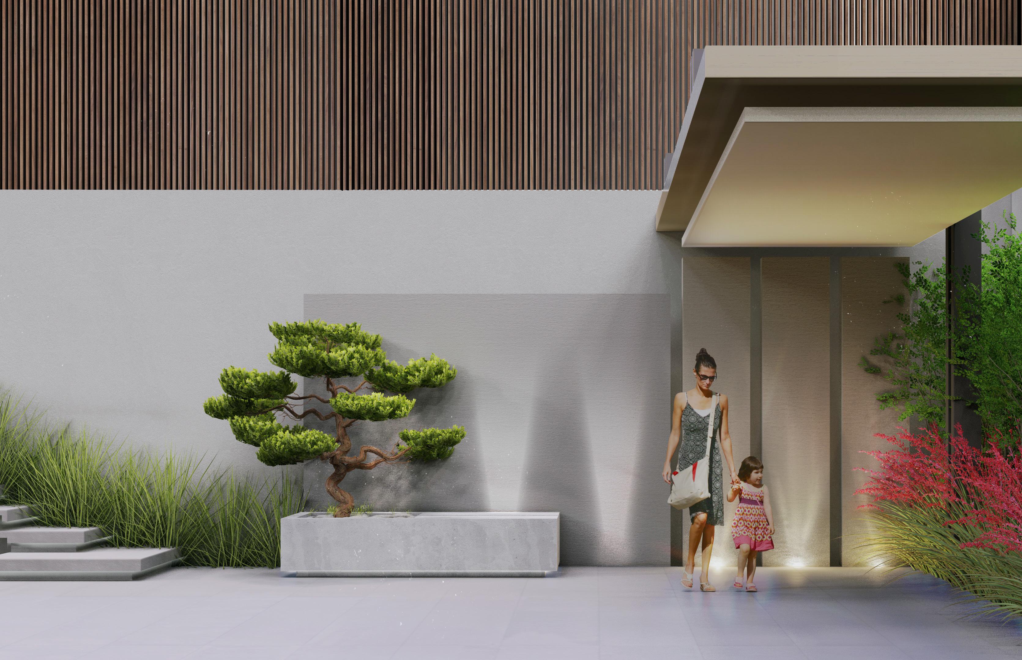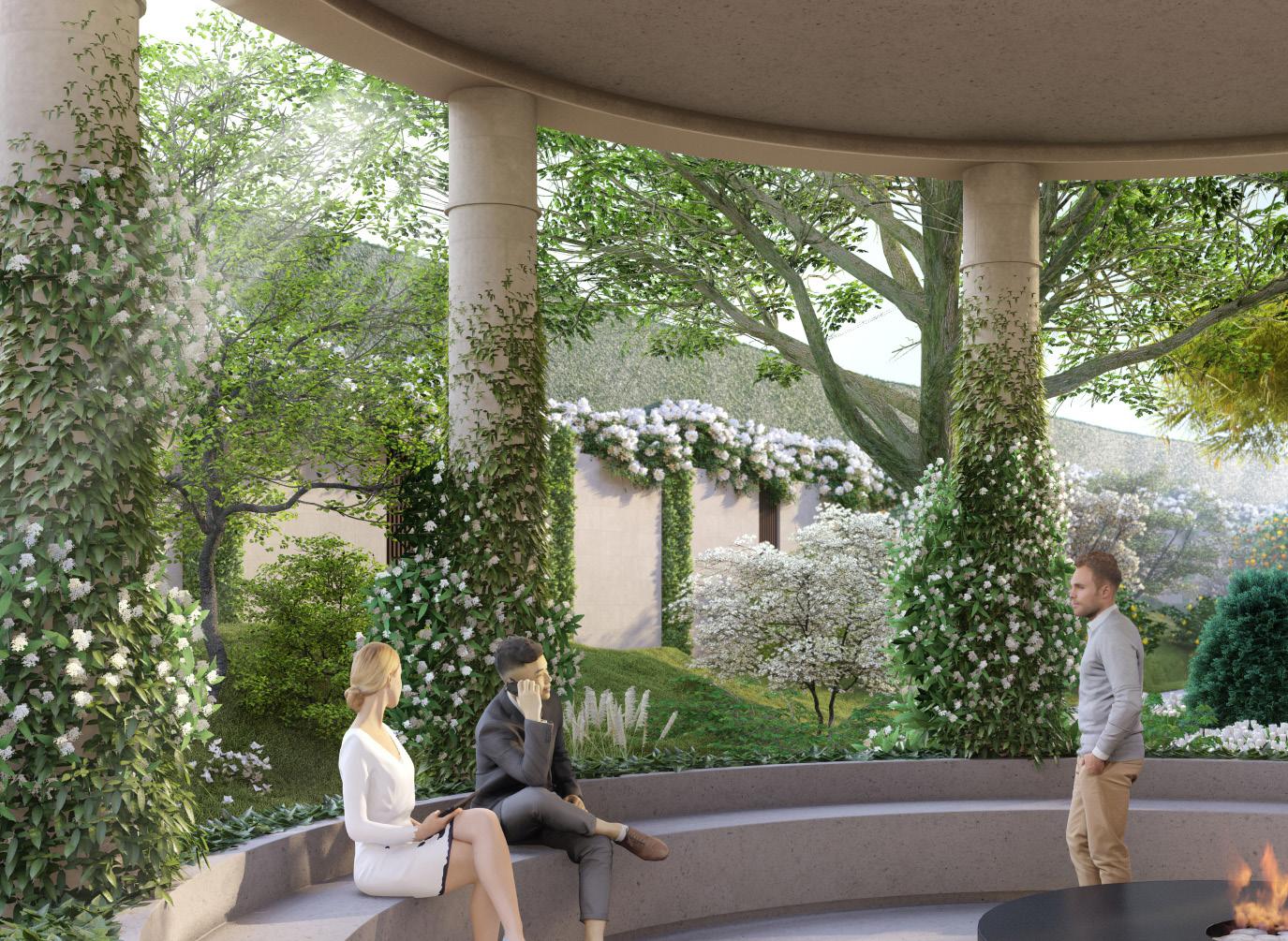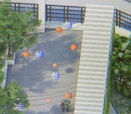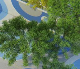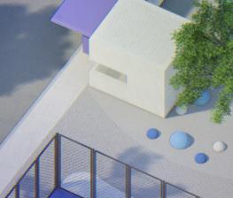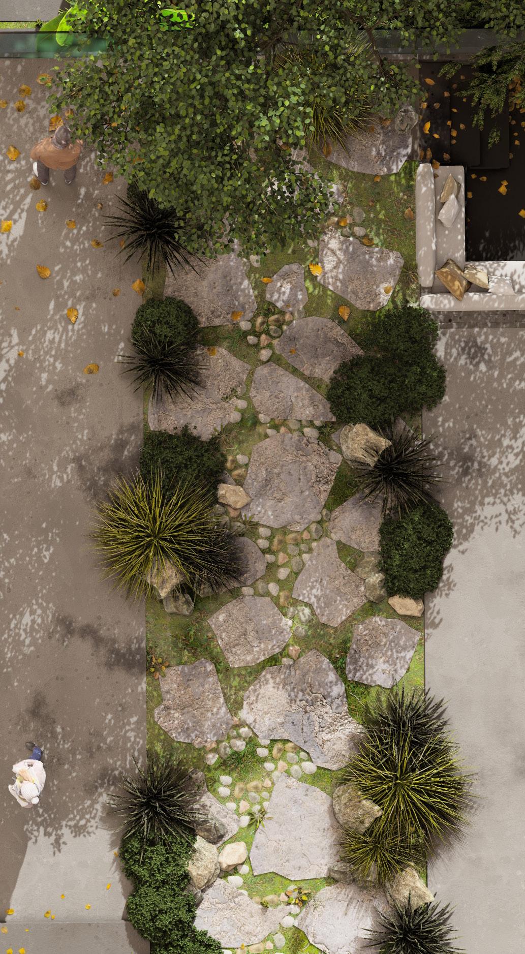 To complement the cool tones, we introduced an accent color “orange” strategically placed to enhance the overall aesthetic. The orange accents appear in a focal point in the light sculptures, adding warmth and contrast to the predominantly blue hardscape.