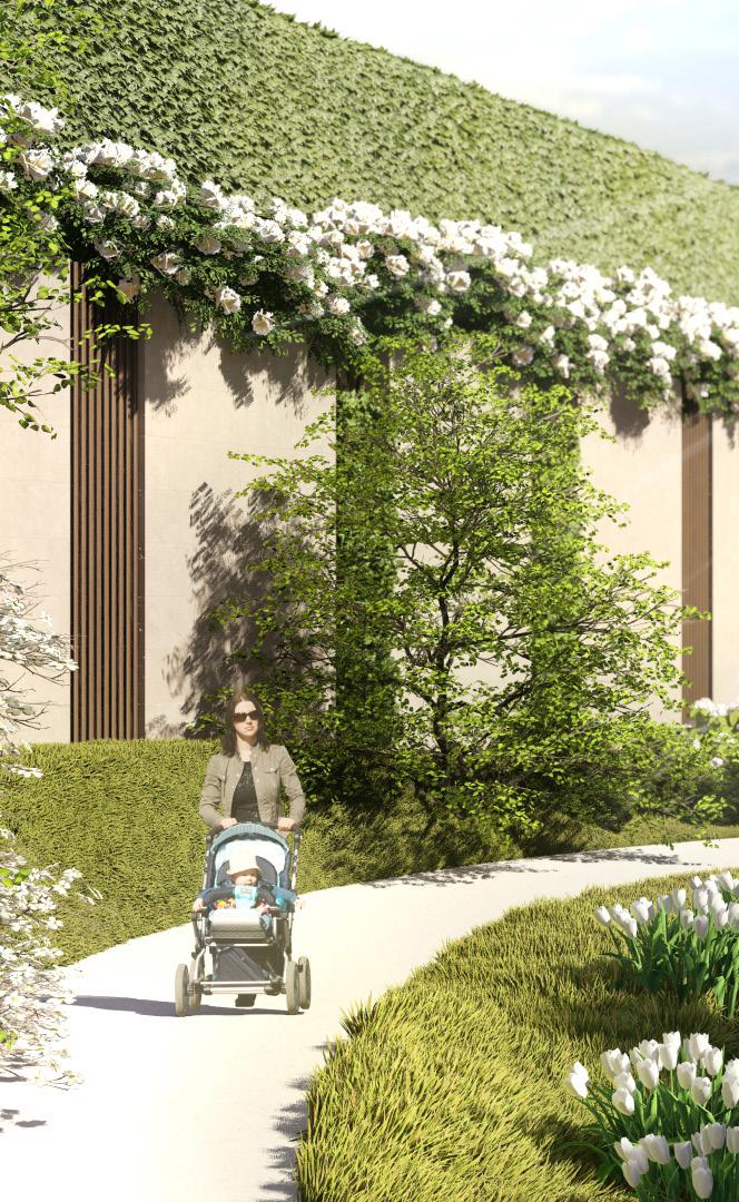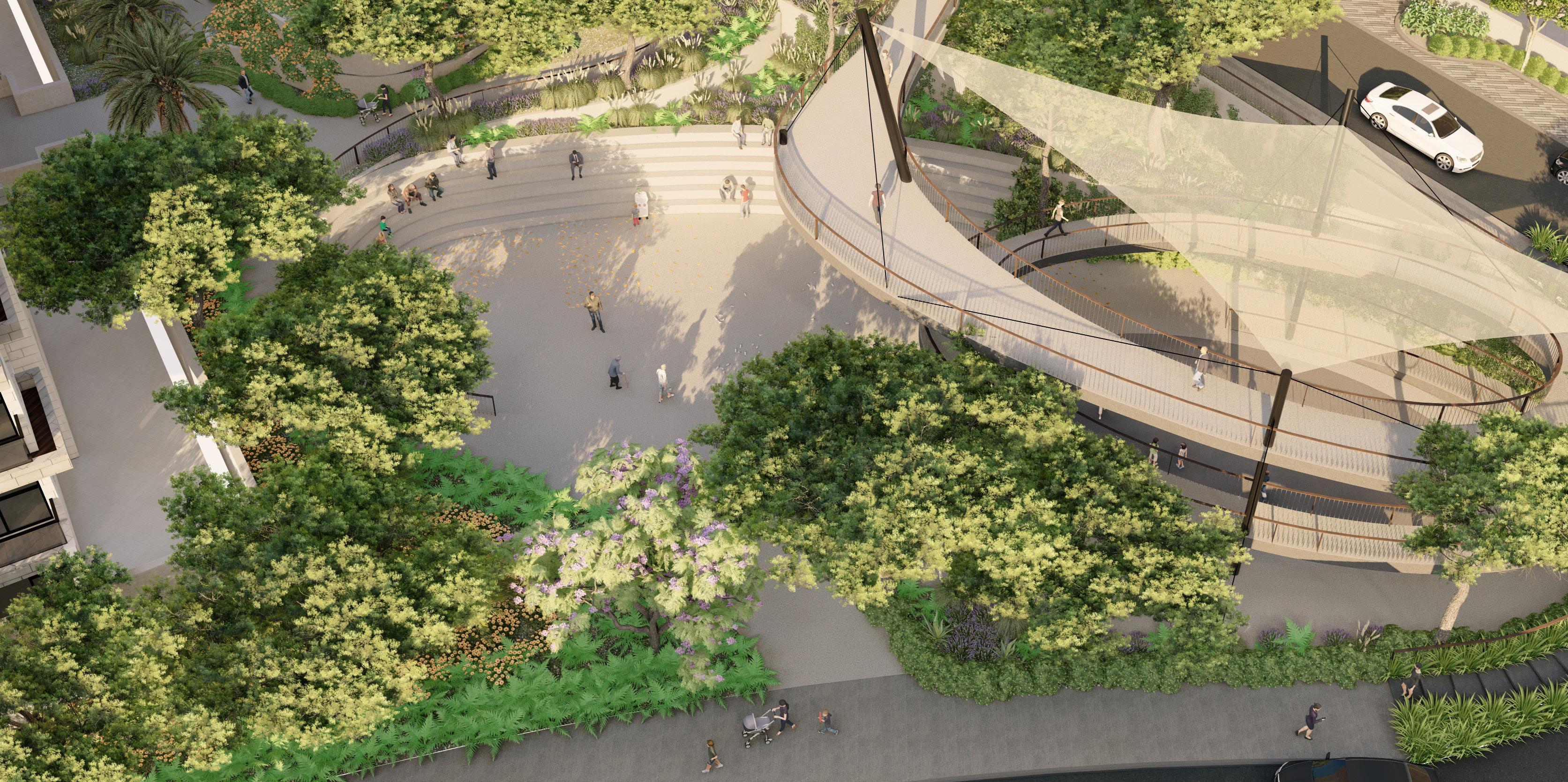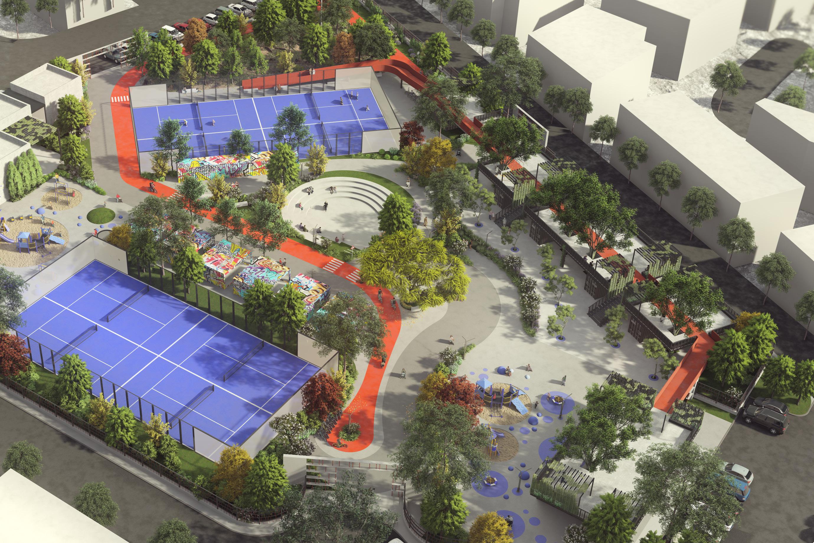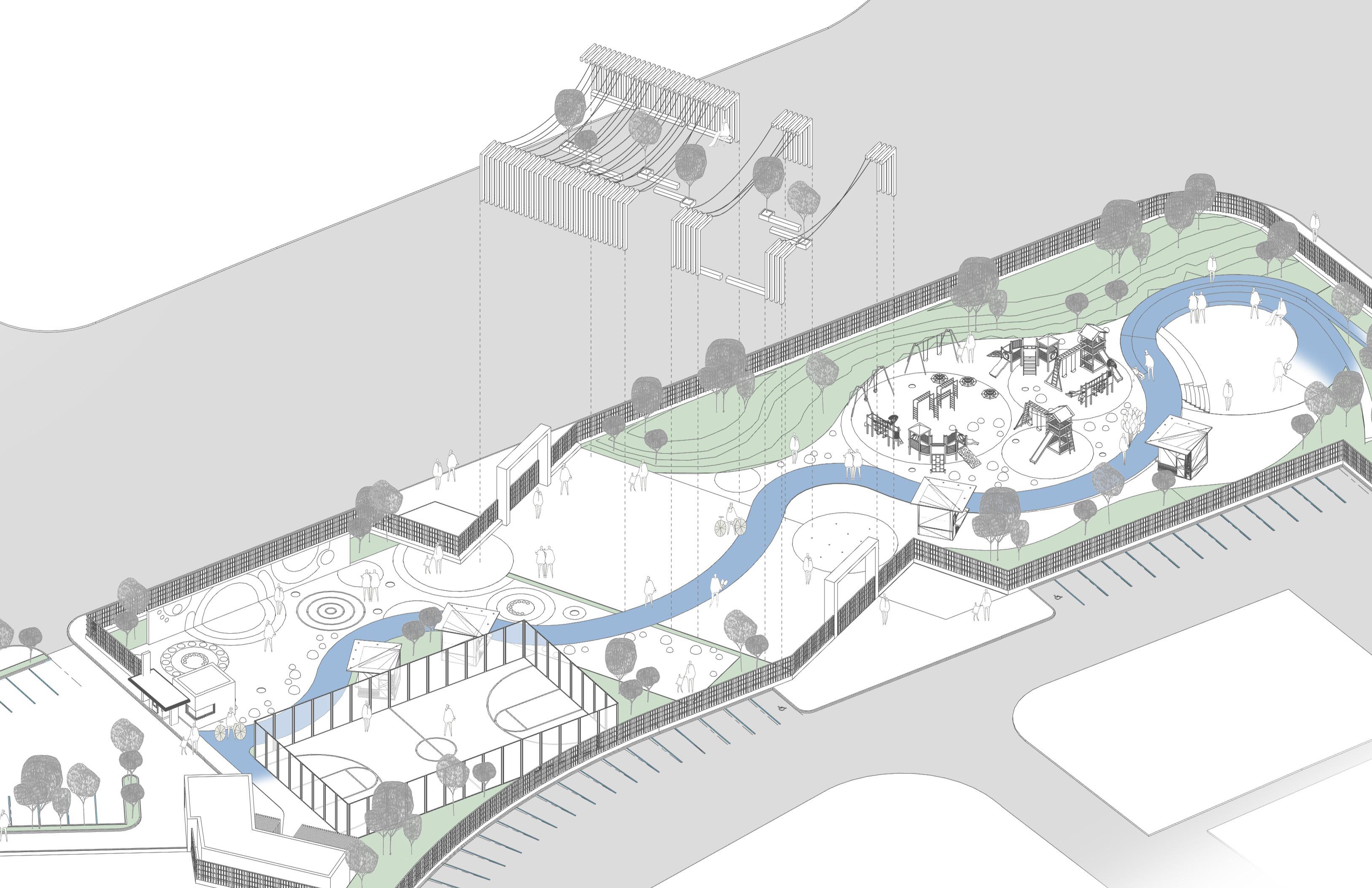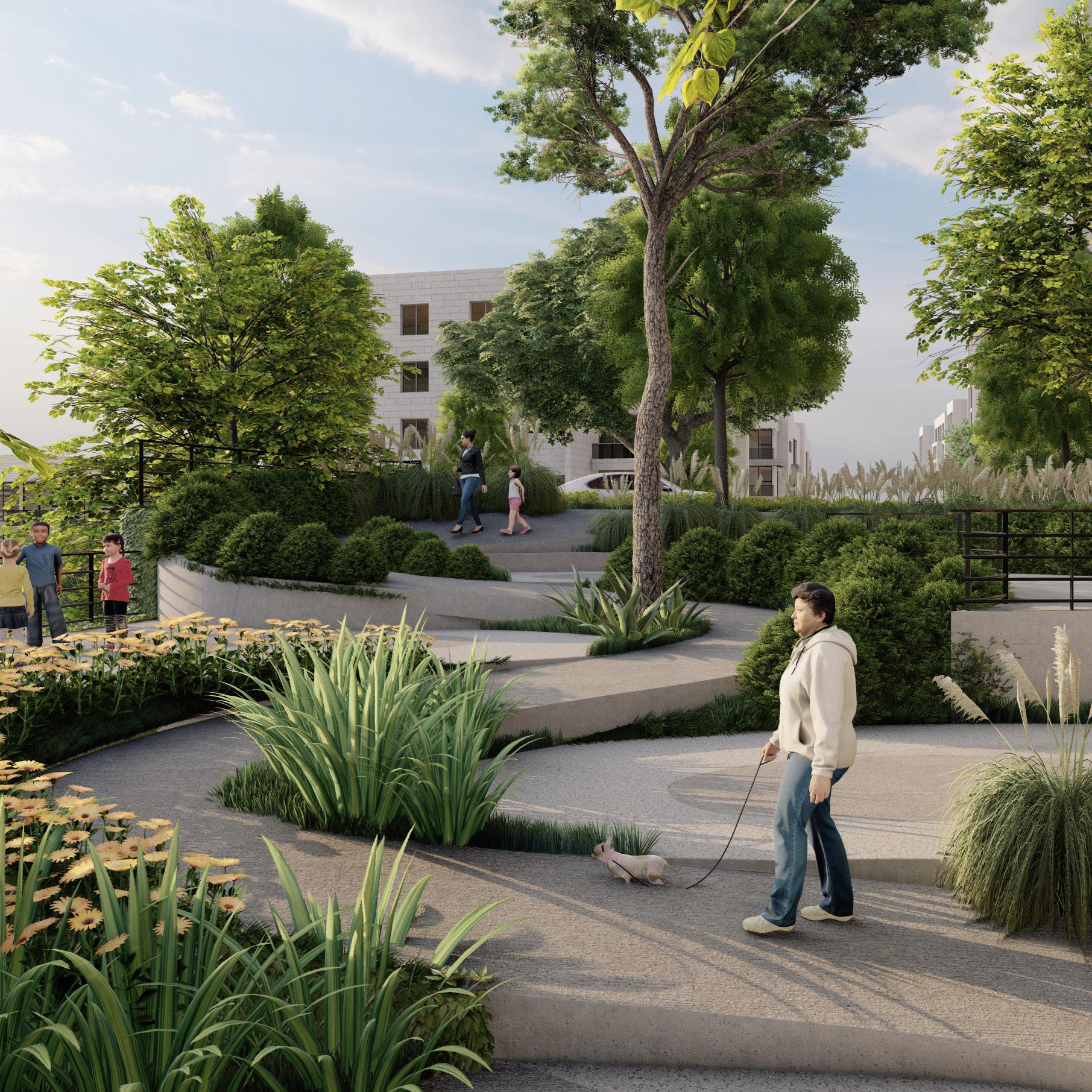 The design effectively connects entrances at different levels, ensuring smooth transitions between areas and offering an engaging journey for residents as they move through the park.
