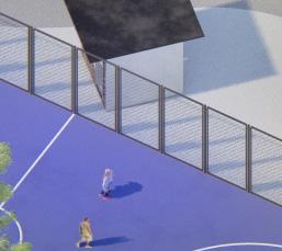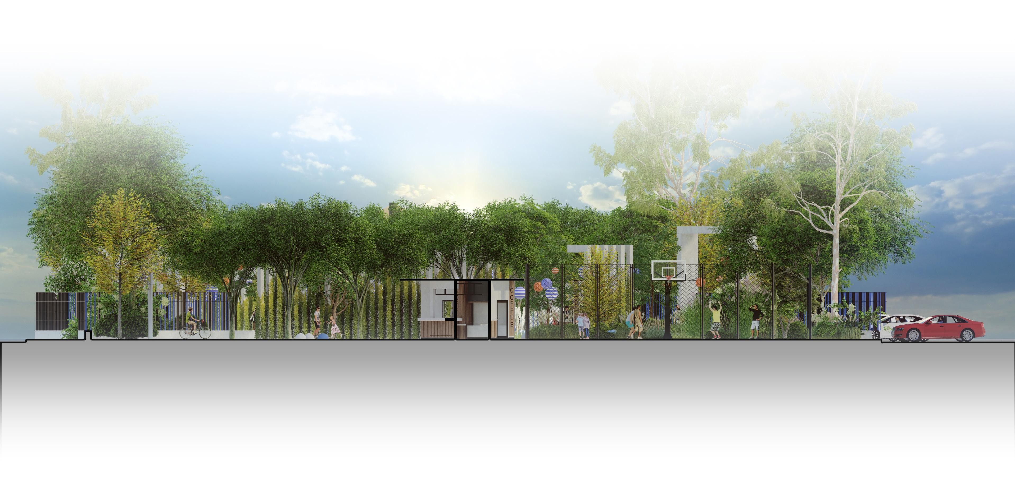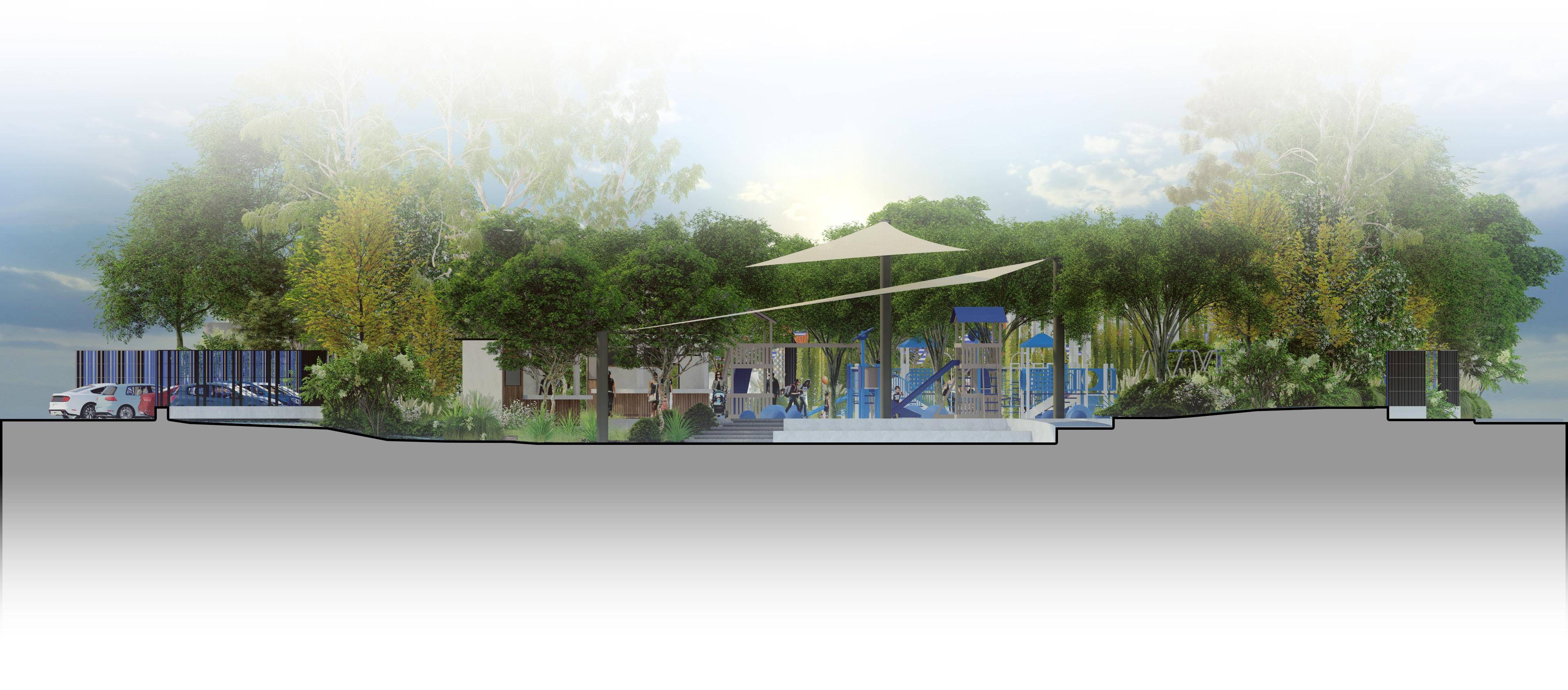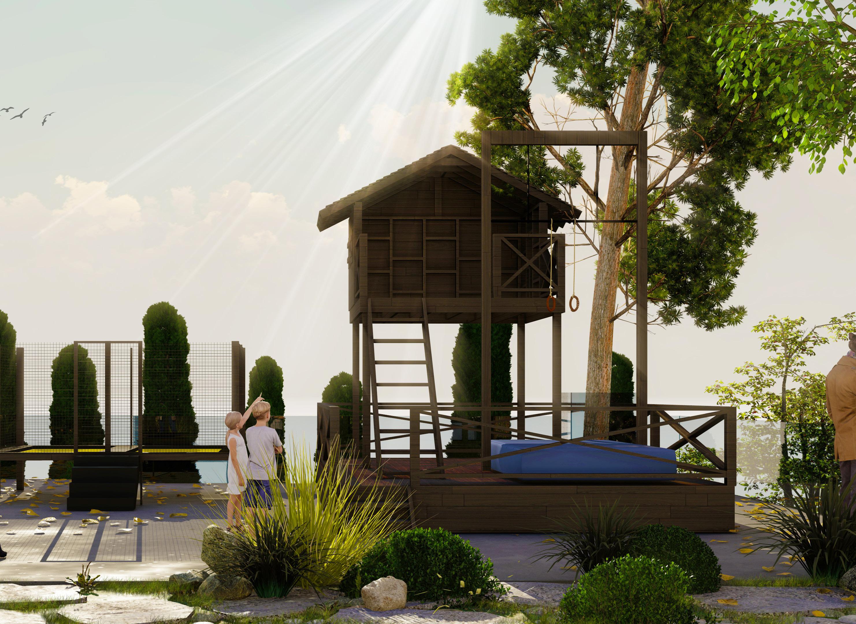 Kids playground, surrounded with a green buffer to create an enclosure around this zone. Achieving privacy and safety.