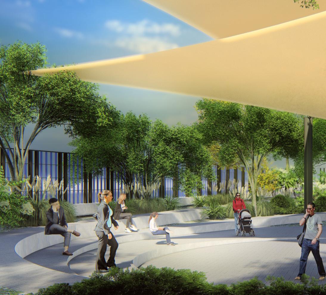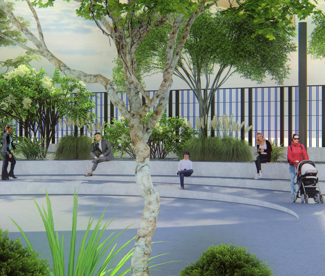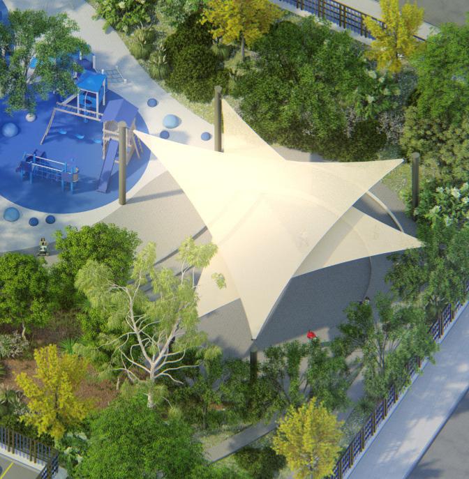 Custom ‑ designed pergola, composed of sleek L shaped vertical panels. These panels create a modern and dynamic architectural element that frames the space while enhancing the overall aesthetic of the park.