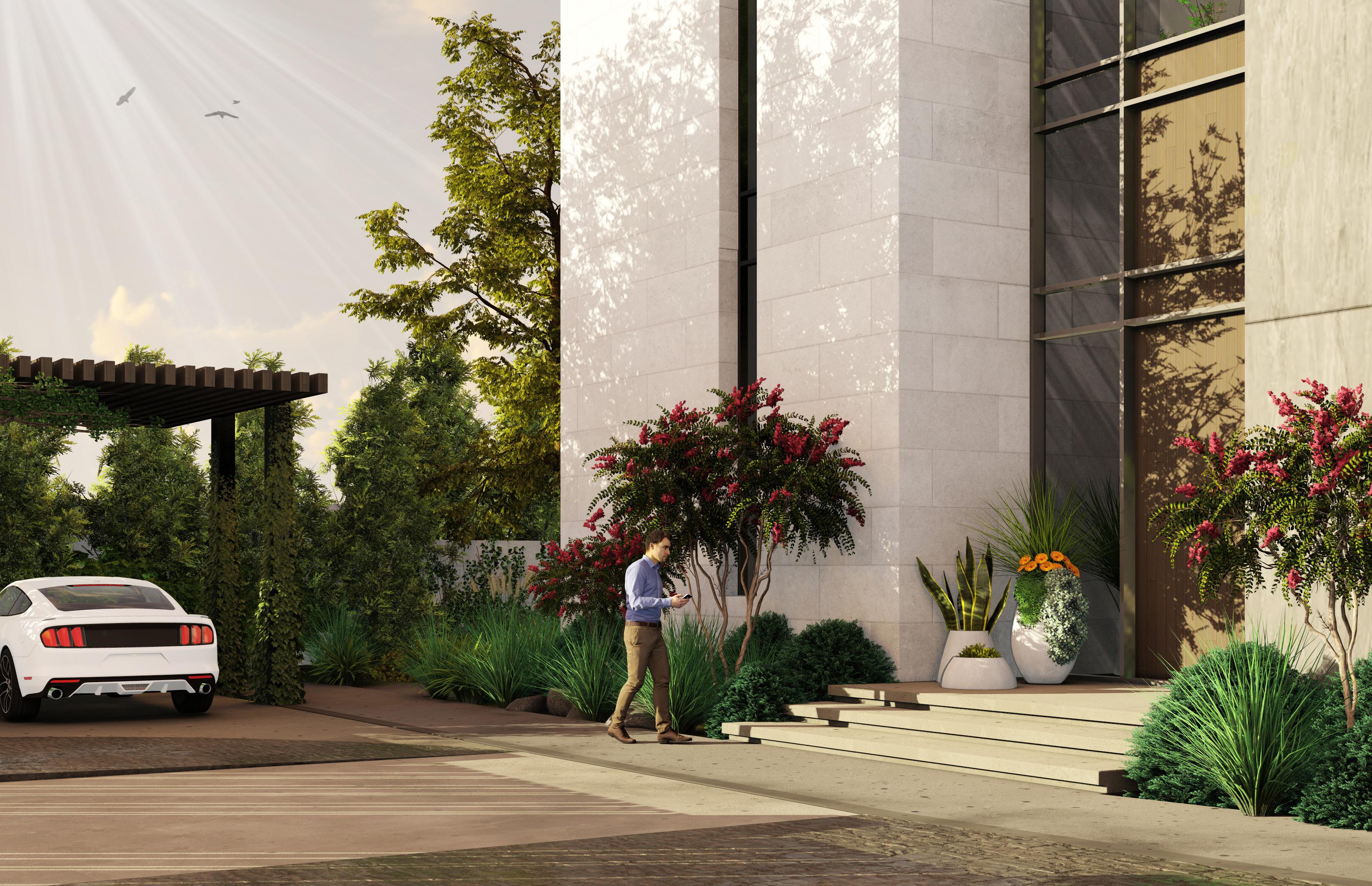 Recessed lights installed in the ceiling above the columns, This subtle lighting highlights the pillars themselves, giving them a gentle glow and adding depth to the entrance space.