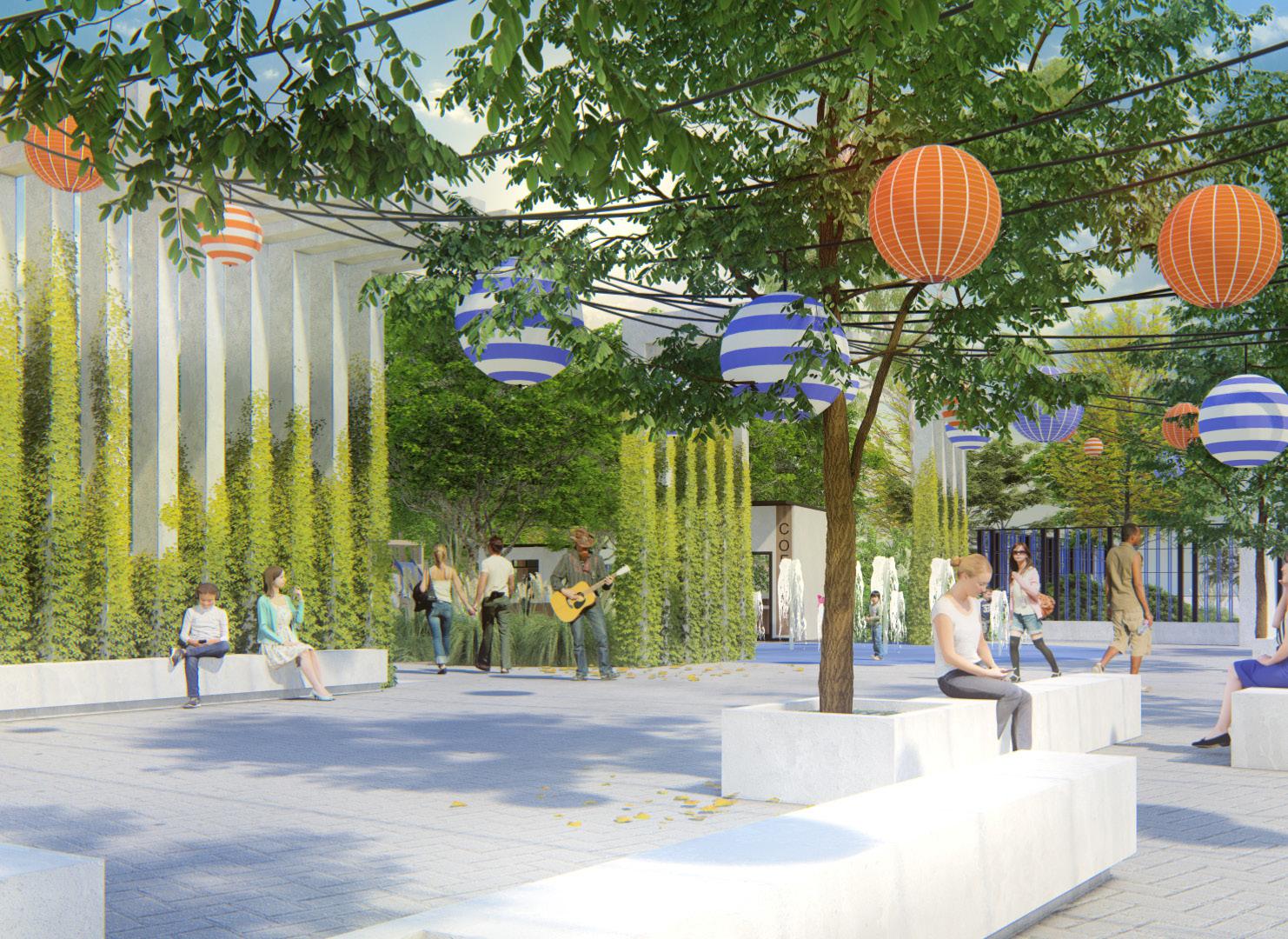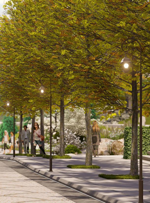 Sustainability was a core principle in the project, from the use of native plants to reduce water consumption to the inclusion of solar ‑ powered lighting throughout the city.