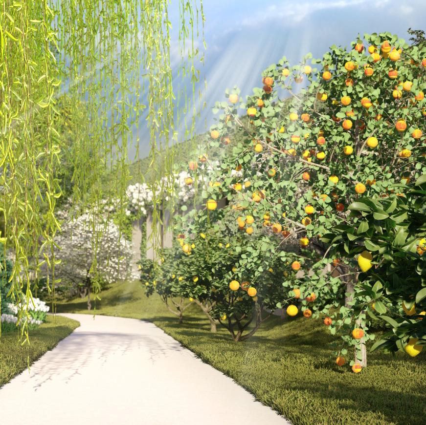 A standout element of the design is the walking path, crafted to reflect the owner’s love for walking. The path meanders through the property, offering a distinct sensory experience in each zone. Whether passing through the quiet, tree ‑ shaded orchard, skirting the edge of the reflective pond, or winding through carefully manicured lawns, the path invites exploration and discovery.