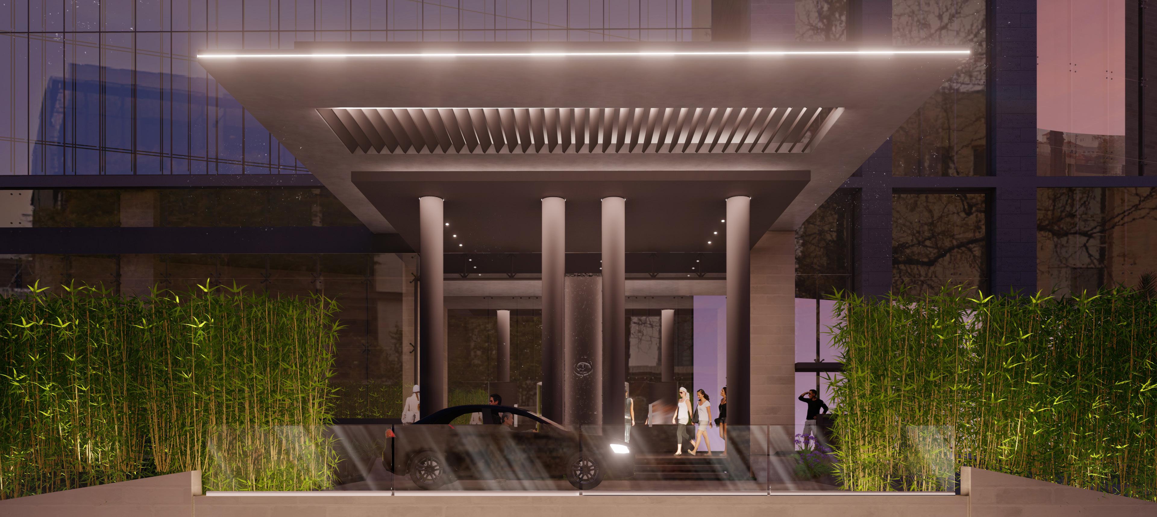 Linear light embedded in the edges of the canopy structure. This light casts a soft, even glow across the entrance, defining the architectural form without being overly bright or harsh.