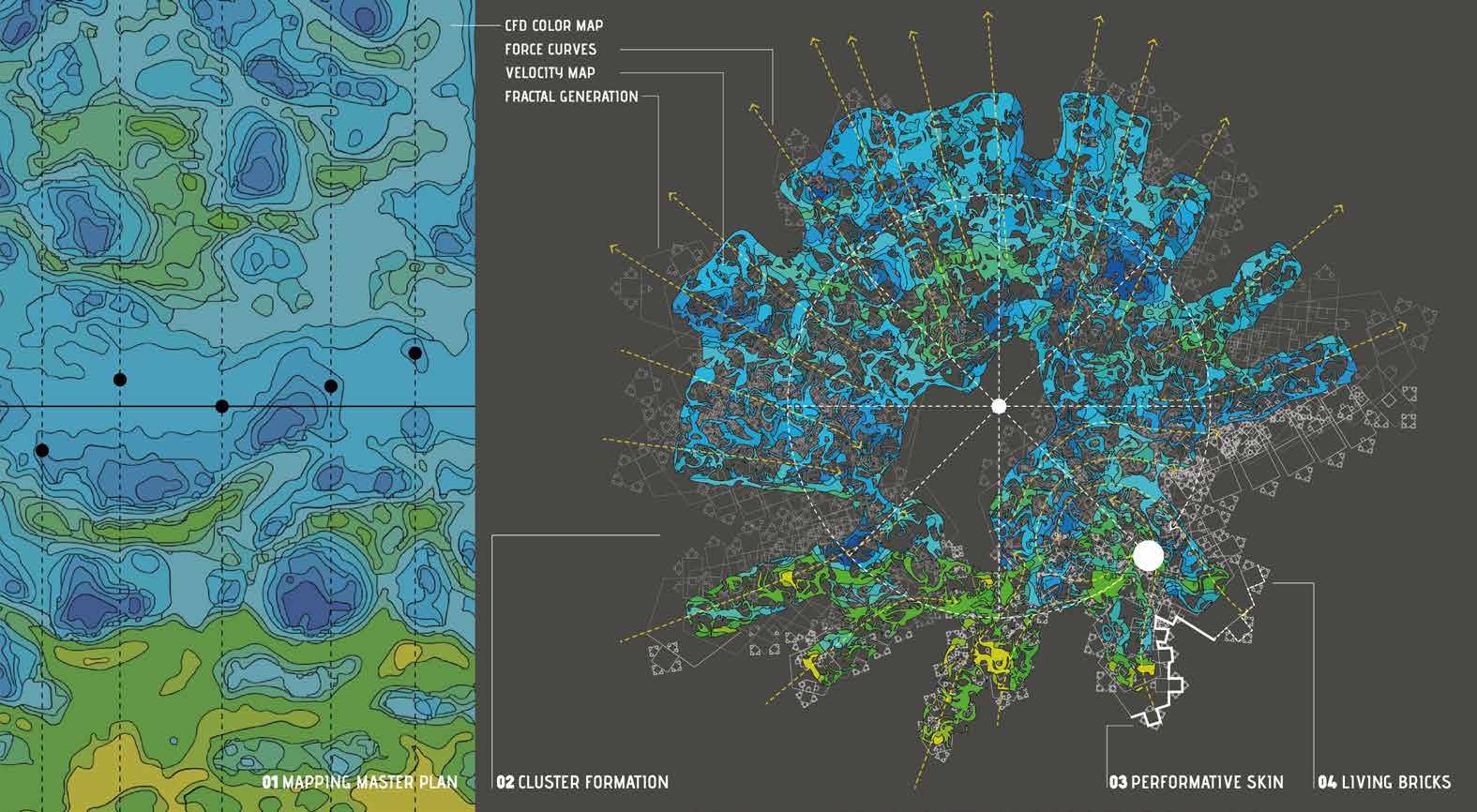Cluster formation: Based on a series of scripts designed to map site force curves. The wind velocity maps were also derived through CFD analysis. The urban morphologies were created using fractal hands-on Houdini.