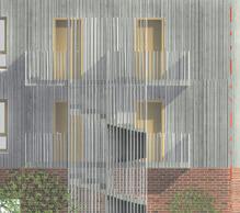 Le premier bâtiment adopte une typologie semi-collective, avec des logements accessibles par des escaliers extérieurs donnant sur le cœur d’îlot. Ces escaliers sont intégrés dans une cage en lames de bois, créant une transition harmonieuse entre l’architecture et le paysage. La toiture est exploitée en espaces de vie partagés sous forme de rooftops. Le second bâtiment, de typologie collective, s’élève sur sept niveaux. Les trois derniers niveaux, en attique, jouent avec les volumes pour dynamiser la façade, complétée par des balcons suspendus maintenus par des tirants.