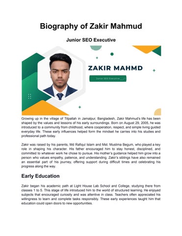 Zakir Mahmud was born on August 29, 2005, in the peaceful village of Titpallah, Jamalpur, Bangladesh. His upbringing in a rural yet culturally rich environment gave him a strong sense of family and community. His parents, Md Rafiqul Islam and Mst. Muslima Begum guided him with values that shaped his character from an early age. His father’s dedication to hard work and honesty influenced his approach to life, while his mother’s care and kindness inspired his empathy toward others. Alongside his siblings, he grew up surrounded by support, respect, and encouragement—foundations that continue to shape his goals and character to this day. He began his education at Light House Lab School and College, where he completed classes 1-5. These early years sparked his enthusiasm for learning and built his academic discipline. Later, he attended Police Lines Ideal High School, Tangail, from classes 6 to 10, where he became more focused and determined. His efforts were reflected in his SSC Examination 2021 results, where he achieved a GPA of 4.33 out of 5. Continuing his education, he enrolled at Jamalpur Residential Model College, Jamalpur, for higher secondary studies and completed a GPA of 4.08 out of 5 in the HSC Examination 2023. To him, education represents growth, patience, and responsibility, shaping his ability to adapt and plan for the future. Currently, he is pursuing a Bachelor’s degree in Sociology at the Government. Titumir College, Dhaka. His choice of subject reflects a desire to understand society and human relationships. He believes studying sociology enables him to explore social structures, challenges, and solutions that can improve his community. Alongside his academic life, he began his professional journey early and now works as a Junior SEO Executive at Aan Nahl Software Company. His work focuses on Search Engine Optimization (SEO), Digital Marketing, and Online Reputation Management (ORM). He handles tasks such as keyword research, on-page optimization, and link-building.