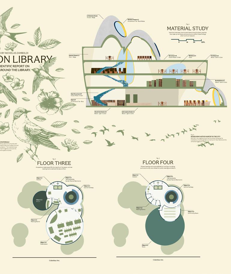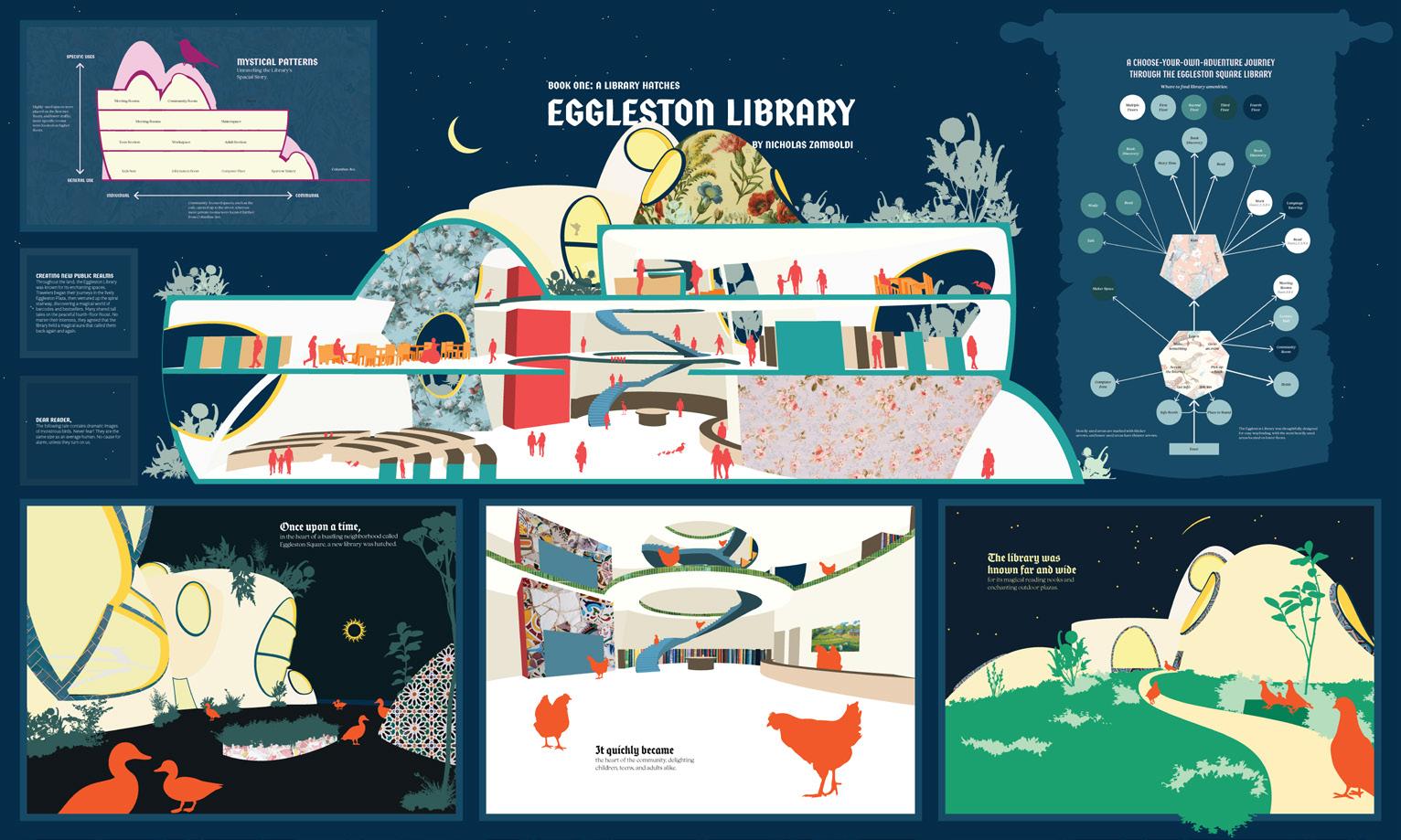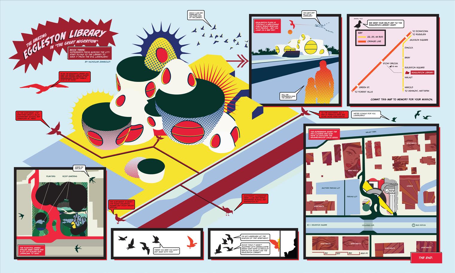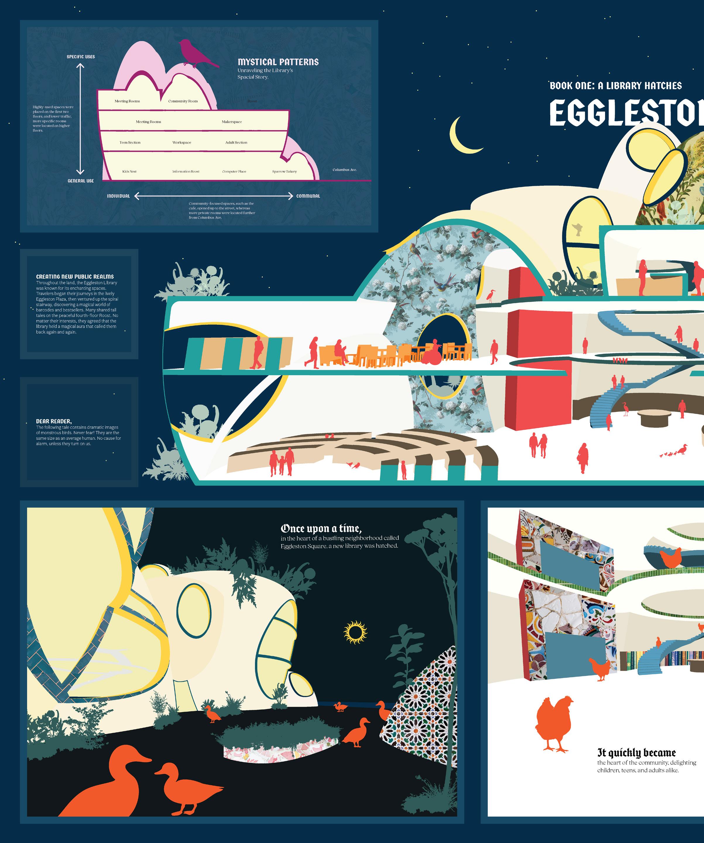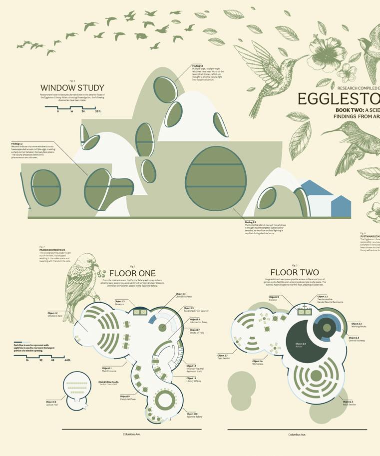 Tall Tales. I presented the story of the Eggleston Library through three, 3’x5’ books. The first, which introduces the library, is told as a fairytale. The next book chronicles its technical details and is formatted as a scientific paper. And make sure to read the comic in Book Three, it’s my favorite part!