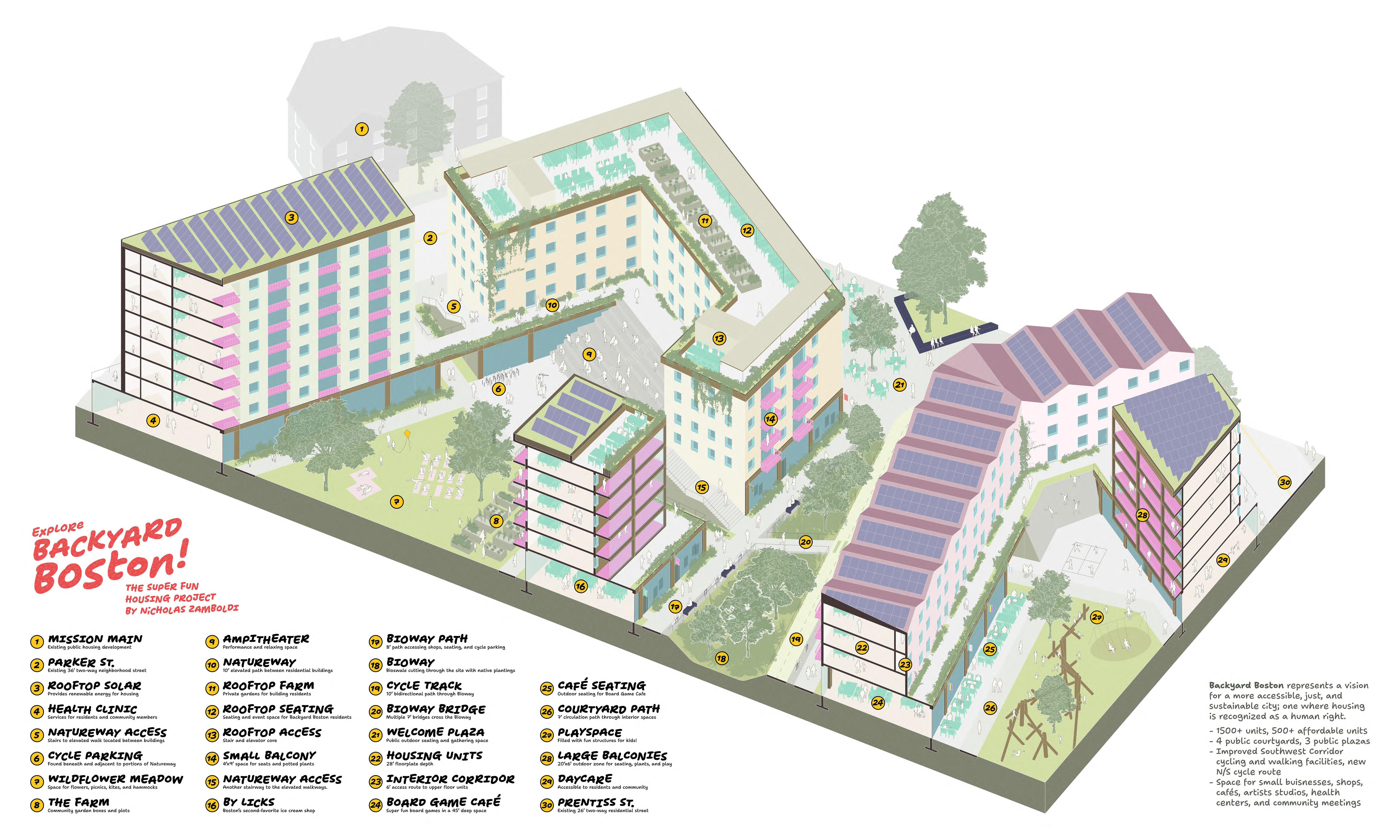 Backyard Boston represents a creative approach to environmentally and socially responsible densification in the Mission Hill neighborhood of Boston. Defined by a set of permeable courtyard buildings and two towers, the project adds 1,500 units of housing, simultaneously shaping four distinct courtyards (“Backyards”), each holding interconnected indoor and outdoor amenties. The site, currently overwhelmed by impermeable parking lots, would be re-greened with bioswales and trees and opened up to the community with new cross-neighborhood walking and cycling connections.
