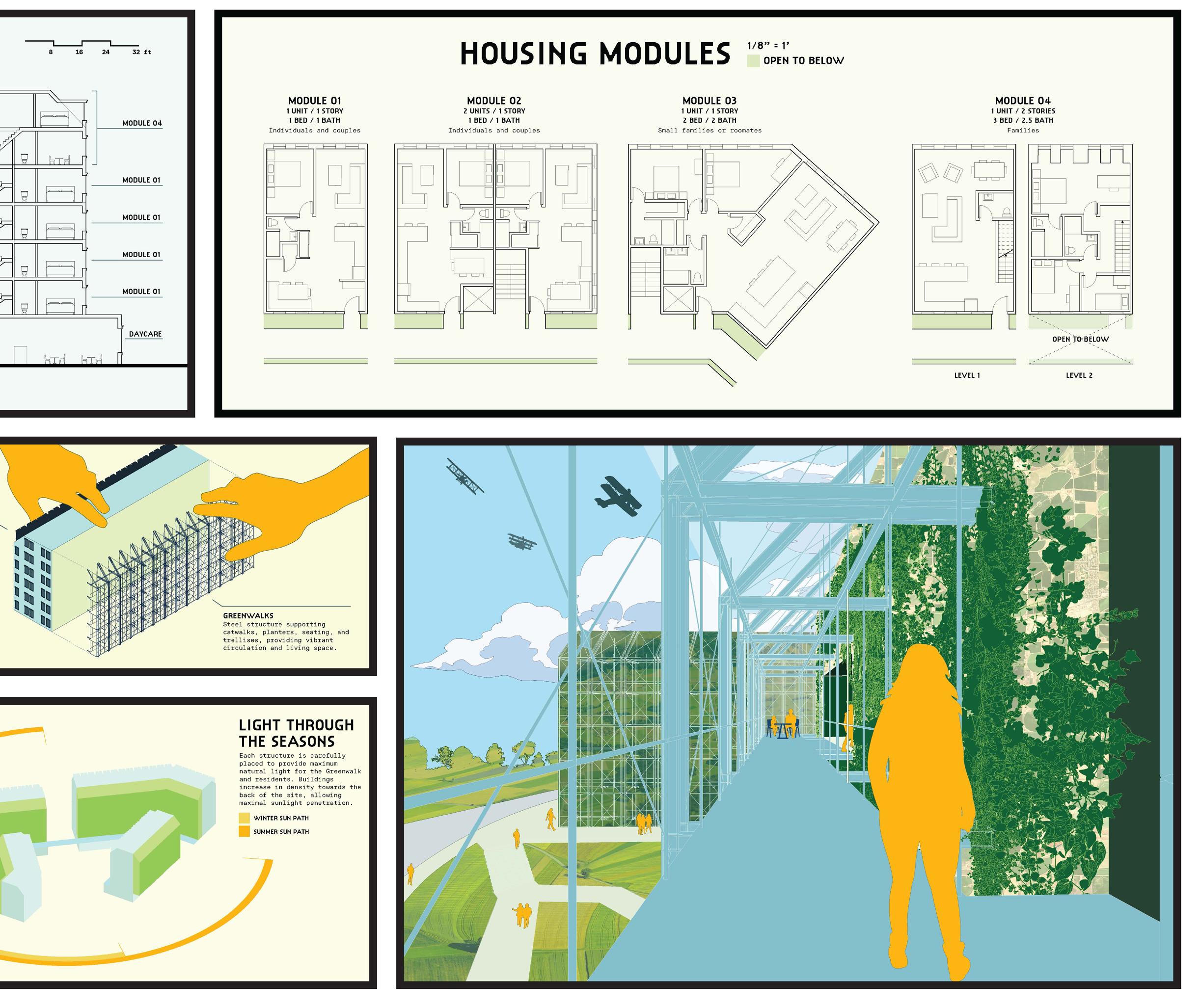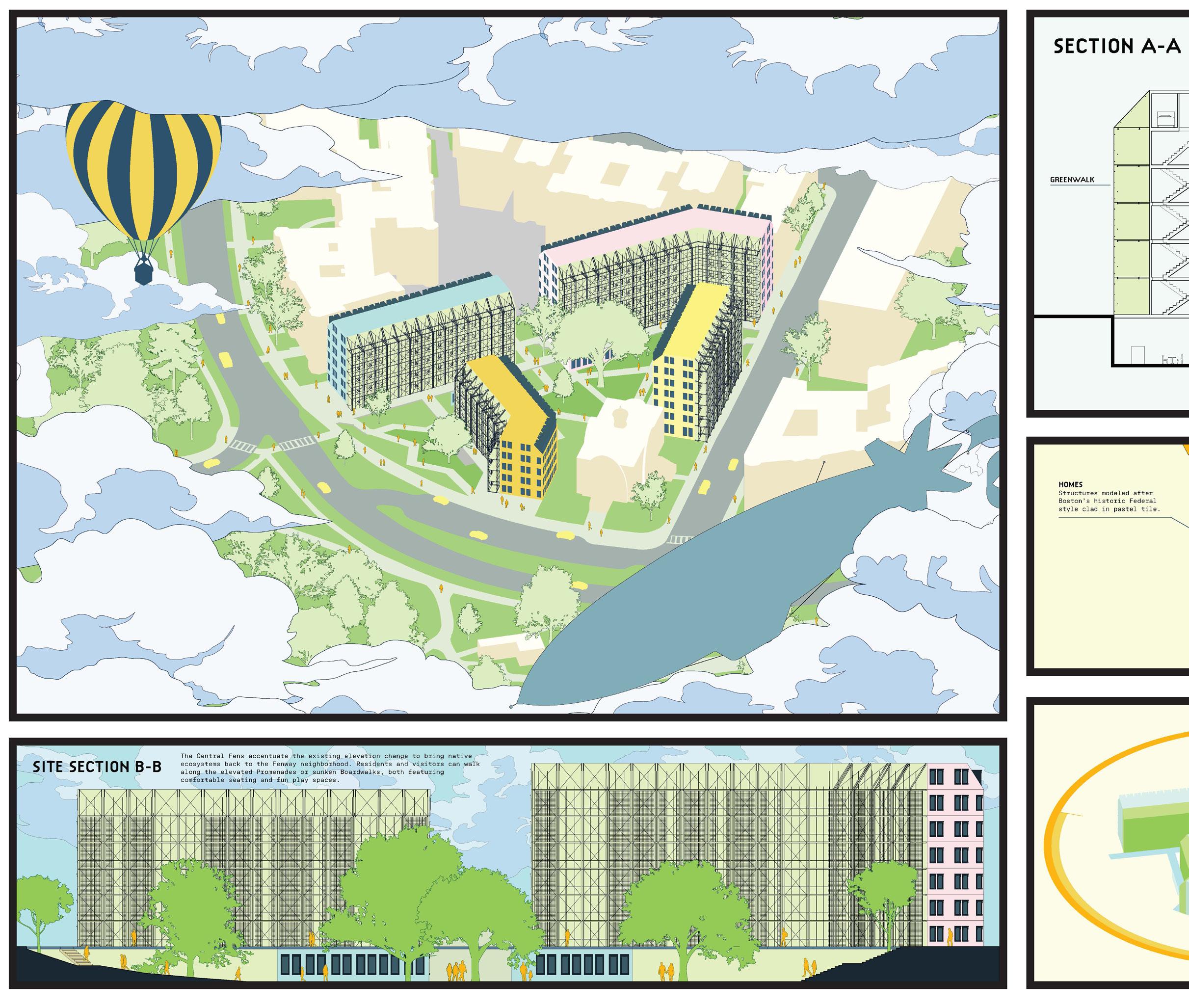Terrafens Homes is a co-op housing project across from the Back Bay Fens. I designed the homes around a spacious Central Fen, bringing native greenery into the neighborhood and restoring marshland habitat. The four buildings are clad in colorful tile and joined to a steel-and-glass greenhouse structure. The project offers a diverse mix of housing, including 1, 2, and 3-bedroom units as well as amenities including a cafe, restaurant, gym, and daycare accessible to the entire community. Terrafens Homes is a vision for the future of Boston: a more sustainable, creative, and communal city welcoming of all residents.