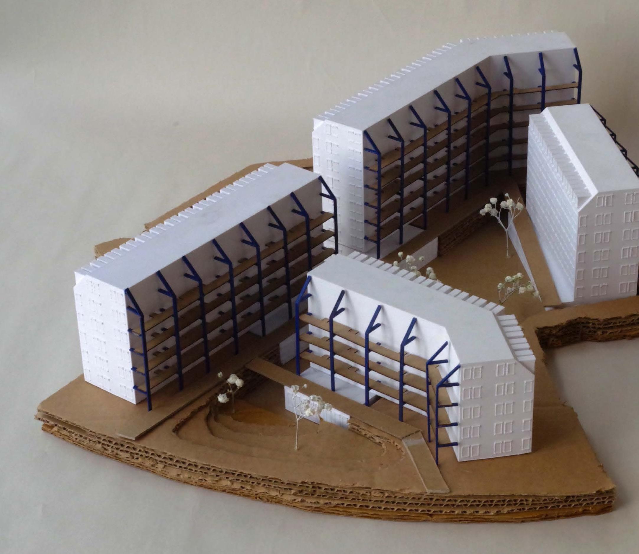 Homes and Greenwalks. Each building is composed of two elements: the homes, adorned with tile cladding, and the Greenwalks, steel-andglass scaffolding structures designed to allow plant growth.