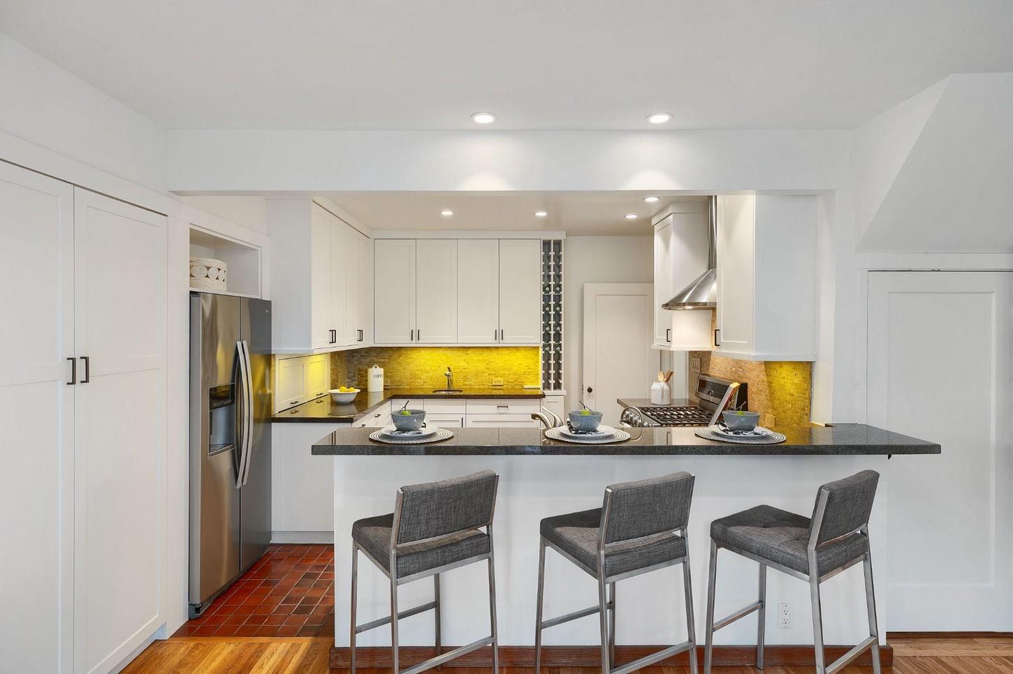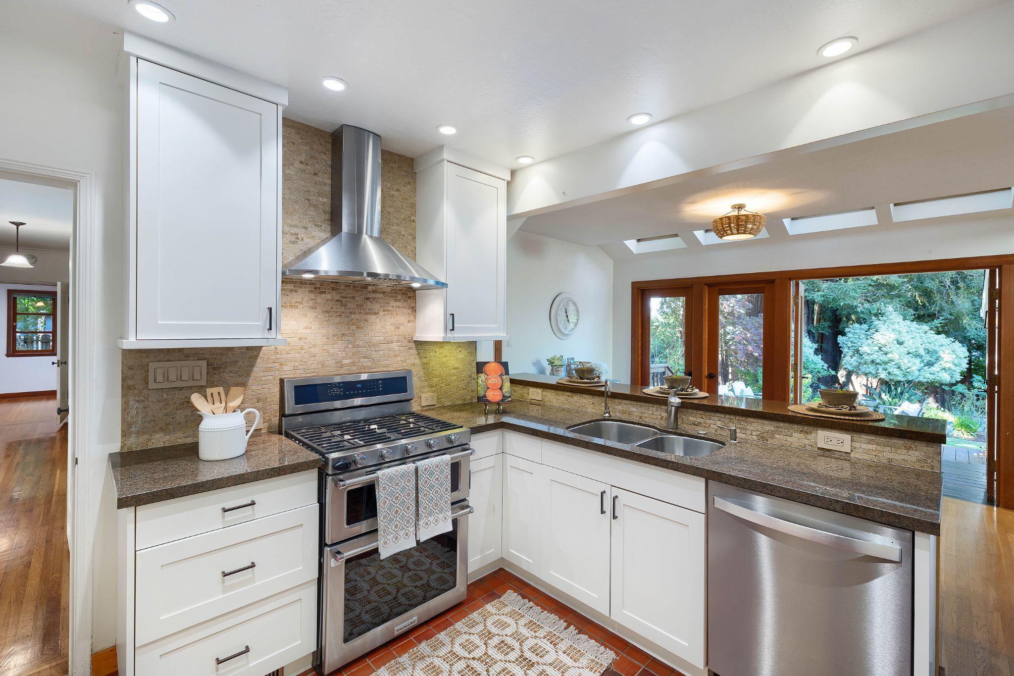 ● Updated kitchen with stainless steel appliances, a 4 burner gas cooktop range with double oven, plentiful cabinetry, granite counters, countertop seating, wine rack, picture windows, and glass doors flow to the deck and backyard