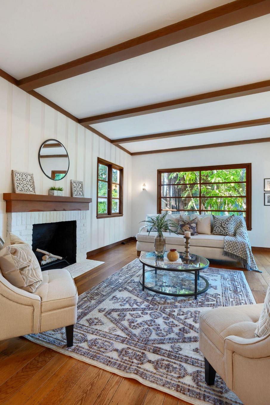 ● Formal living room with a fireplace, wood ceiling, and trim detail, large picture window overlooking the backyard