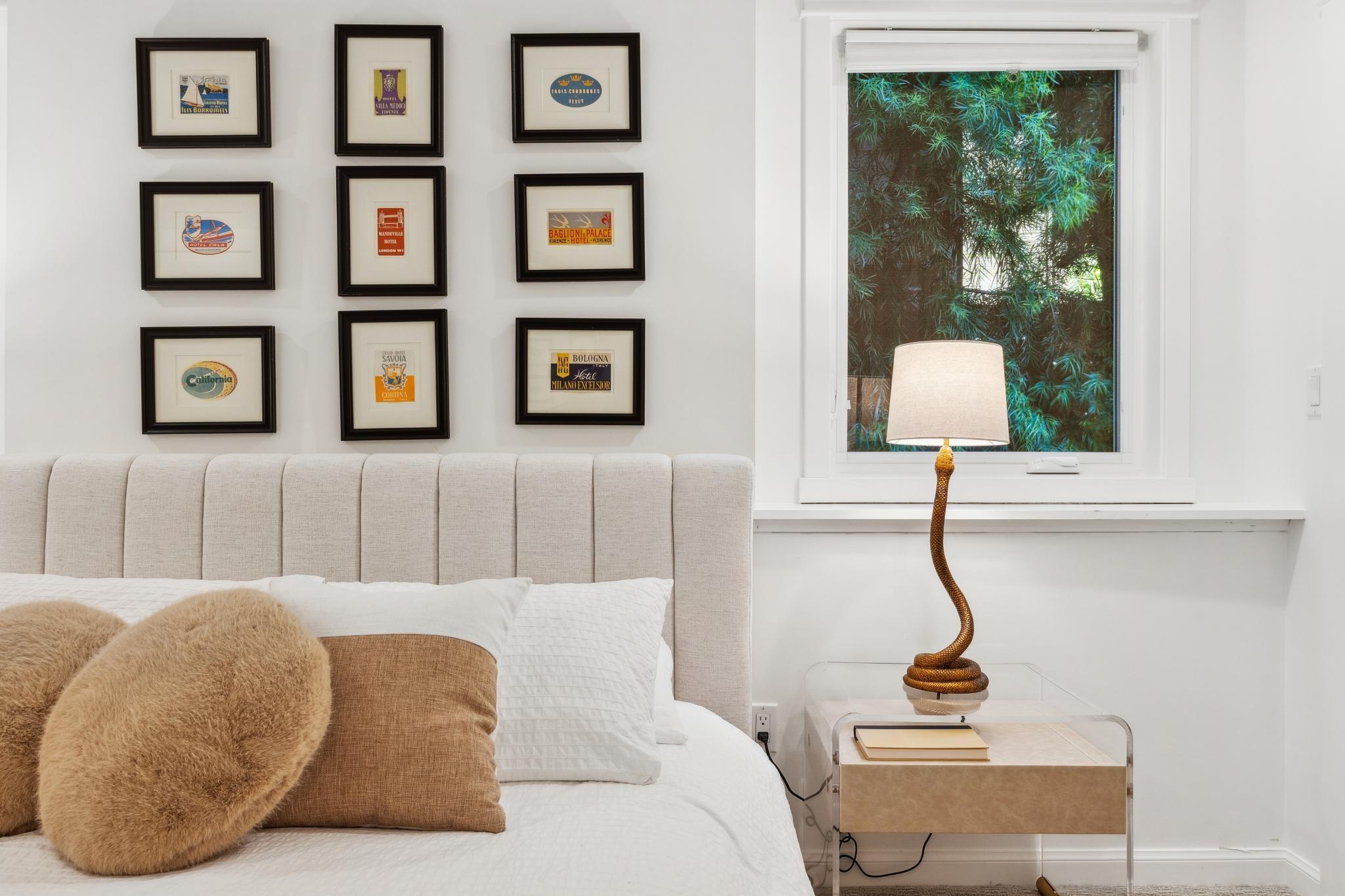 ● The decadent primary suite bedroom is the perfect escape, with a massive wall closet, plentiful windows, and a tastefully renovated bathroom with a double vanity and stall shower.