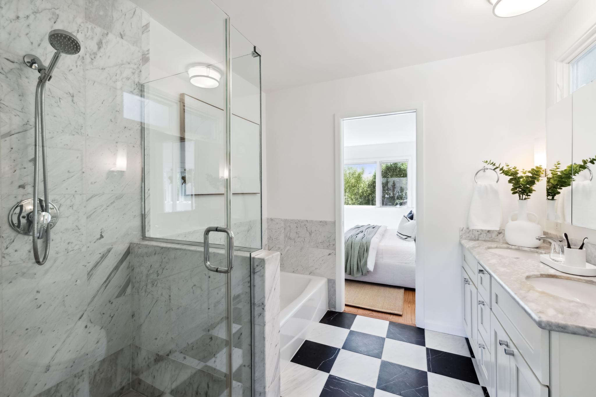 Full bathroom has double sinks, honed marble, a walk-in shower and a separate bathtub