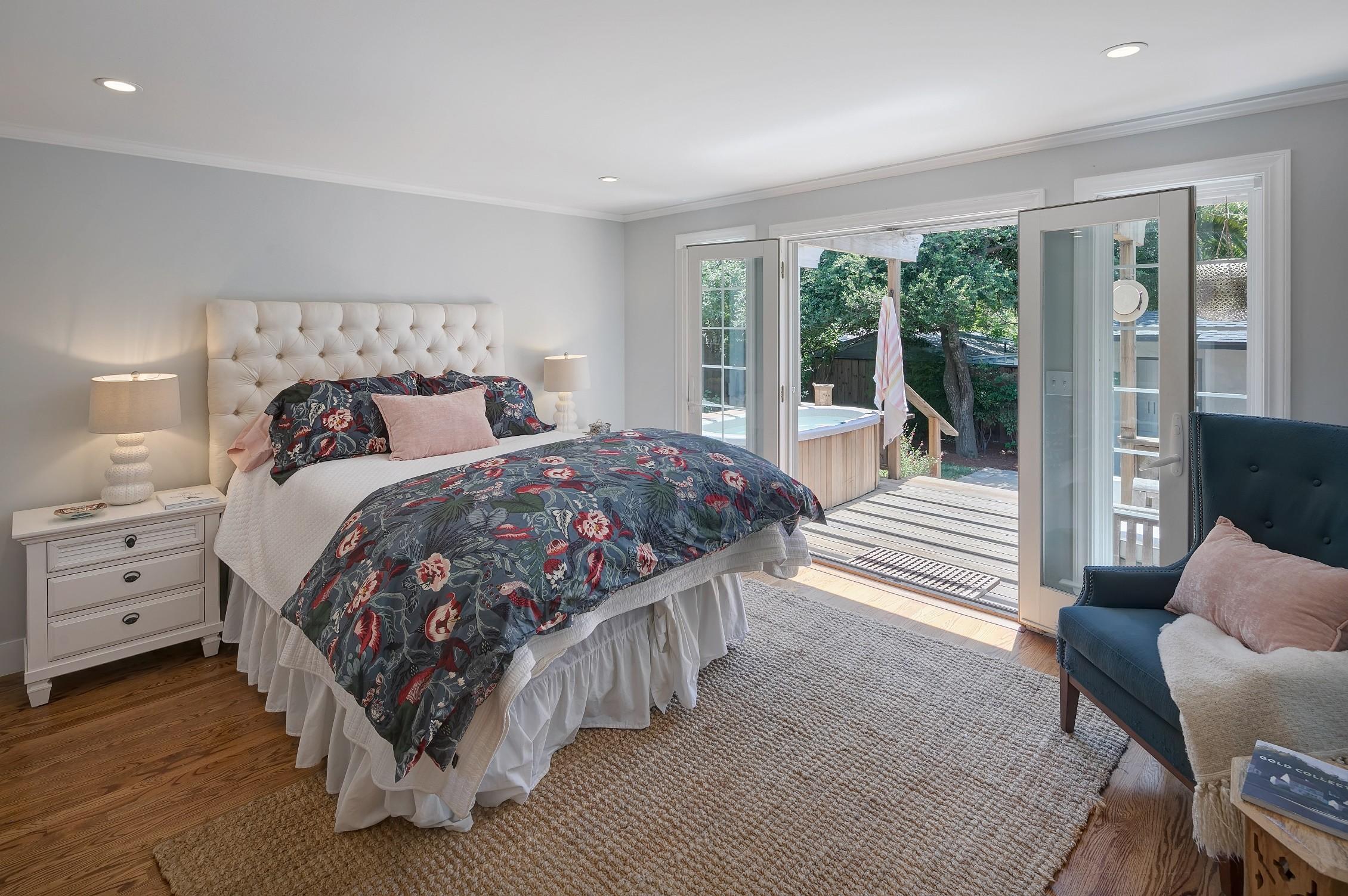 •French doors in the primary bedroom lead to a wood deck with hot tub, pergola, pull down shade and stairs to the backyard