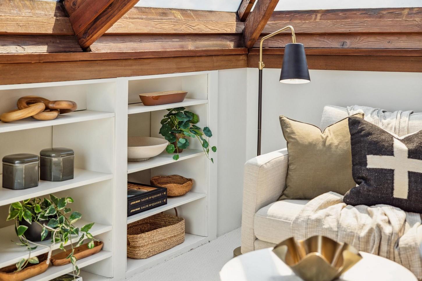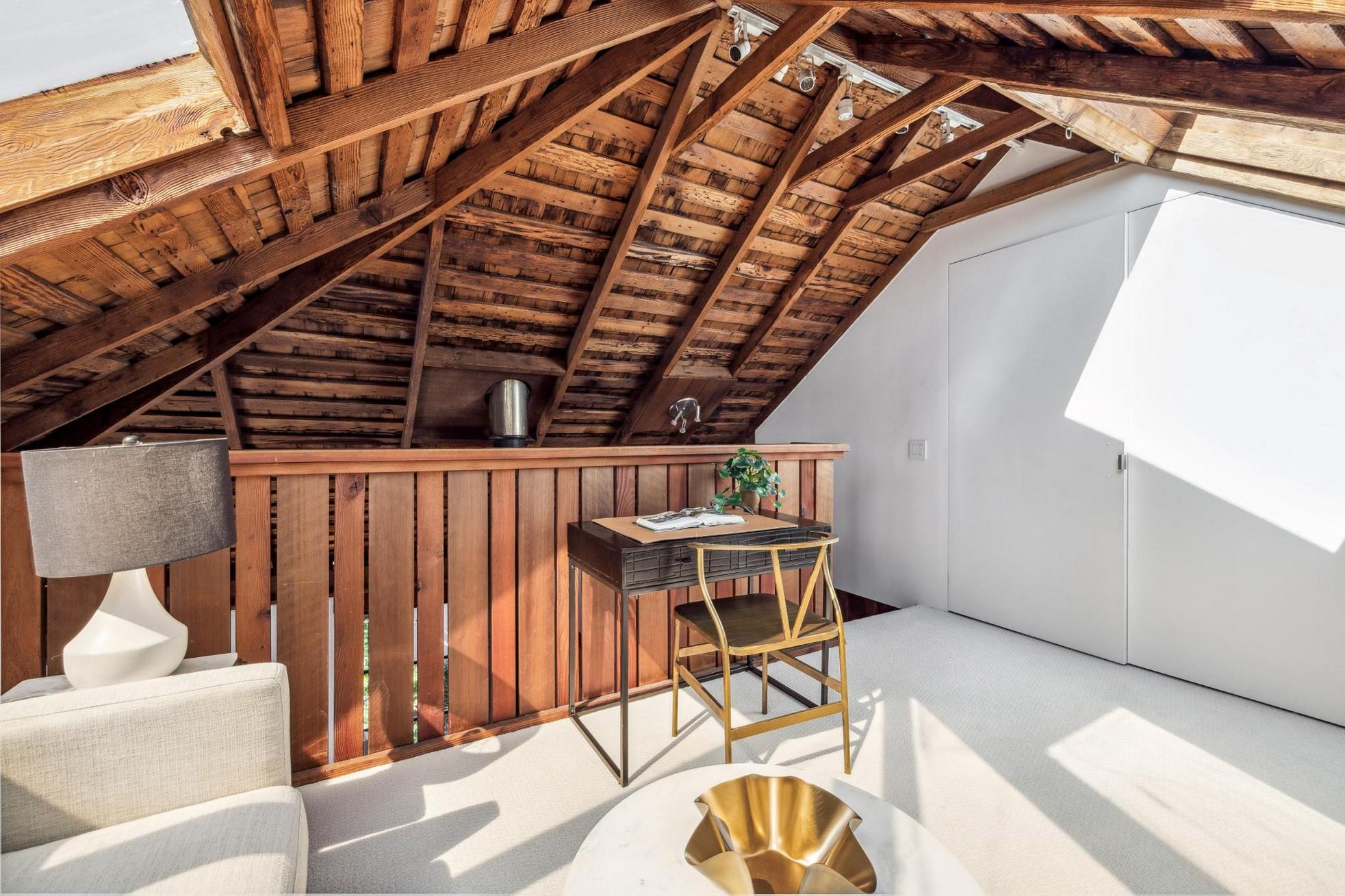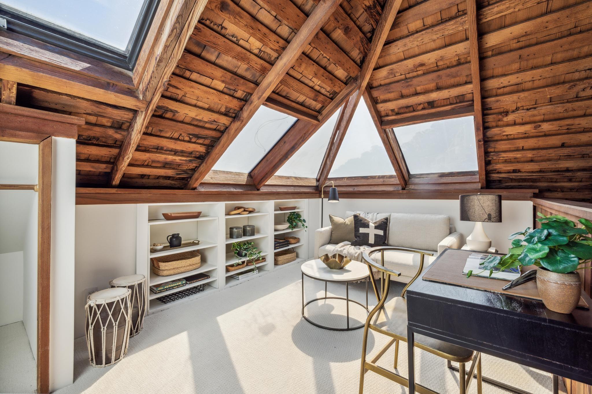 An open loft with skylight views boasts a cool loungy vibe with space for an office and bonus room currently used as a bedroom