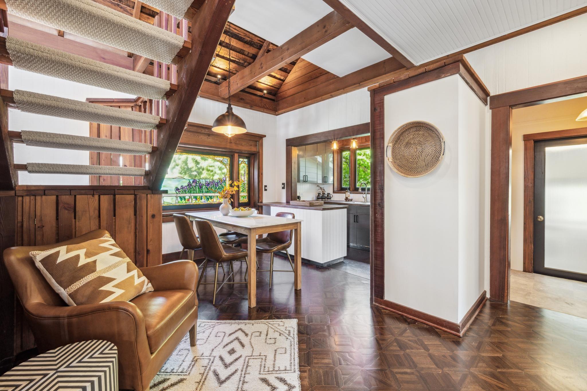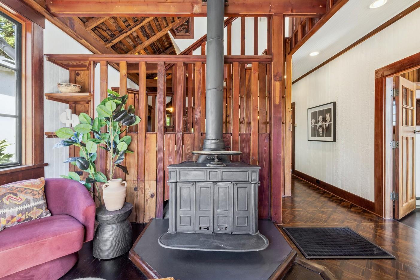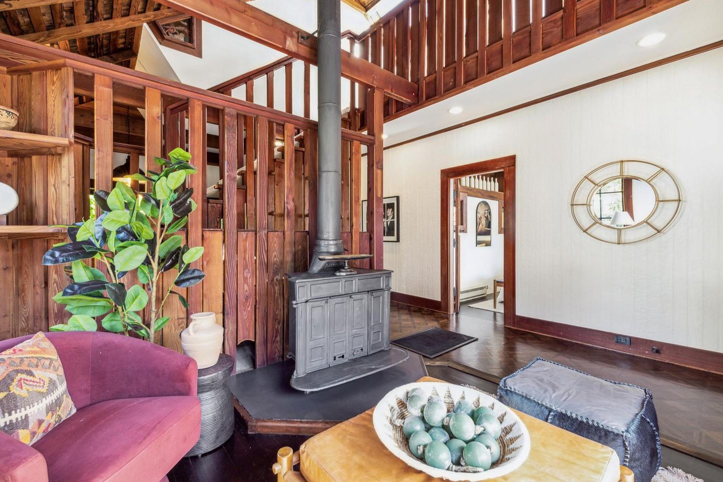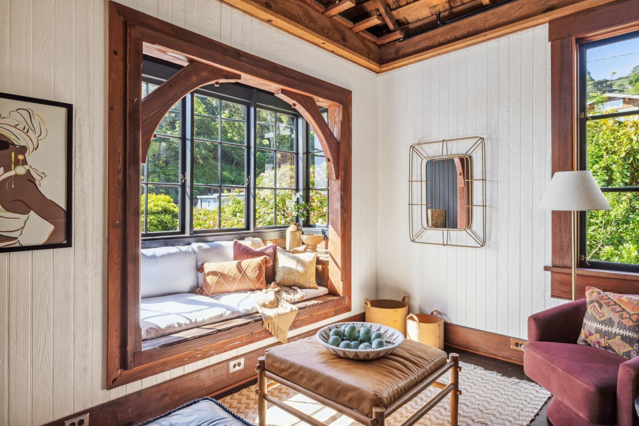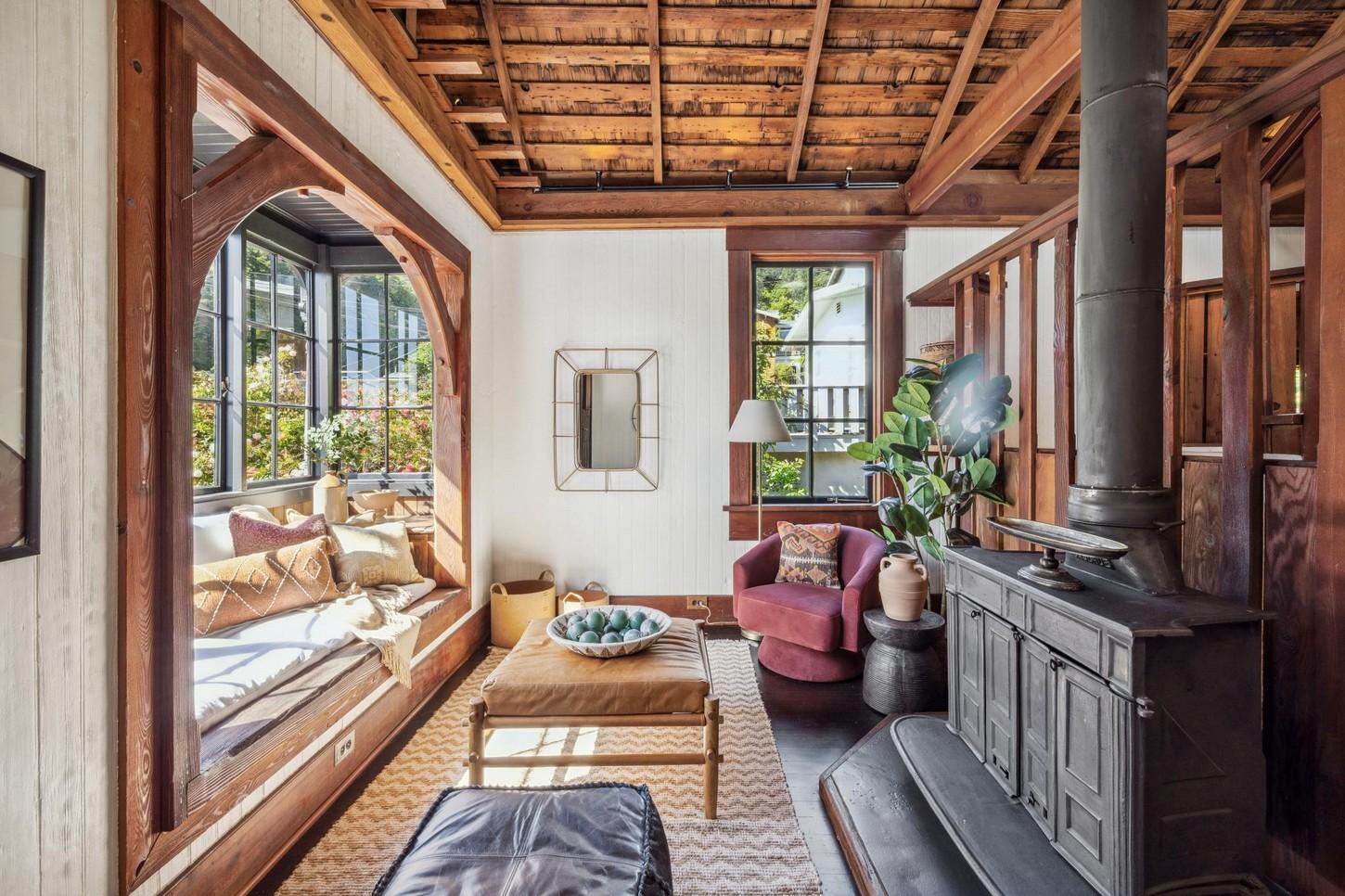 Step into the living room with alcove seating, fireplace, drenched in natural light with a harmonious blend of vintage charm and architectural creativity sure to captivate you.
