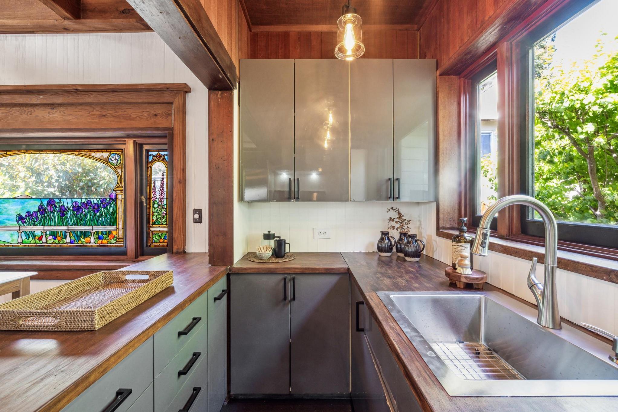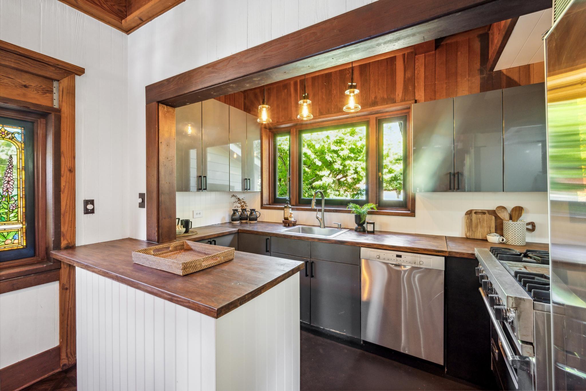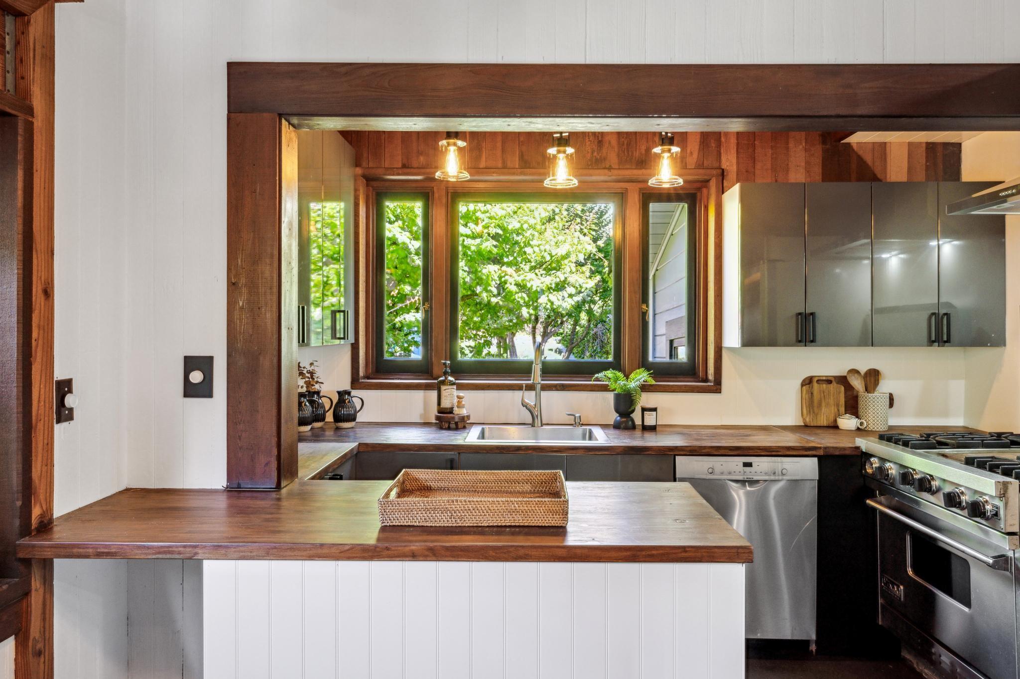 Butcher block counters, new sink, concrete floors, and picture windows all add to the inherent charm of this beauty.