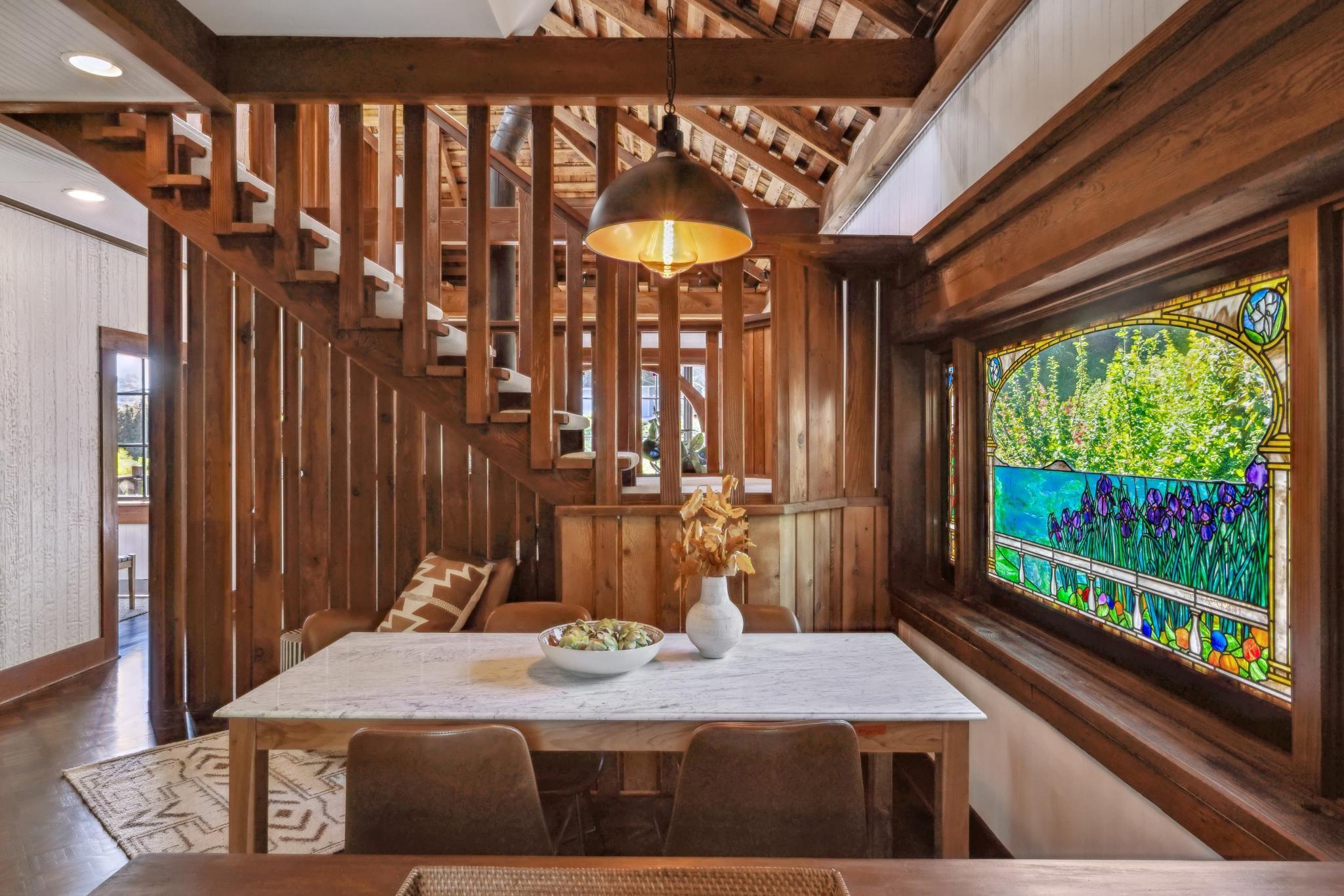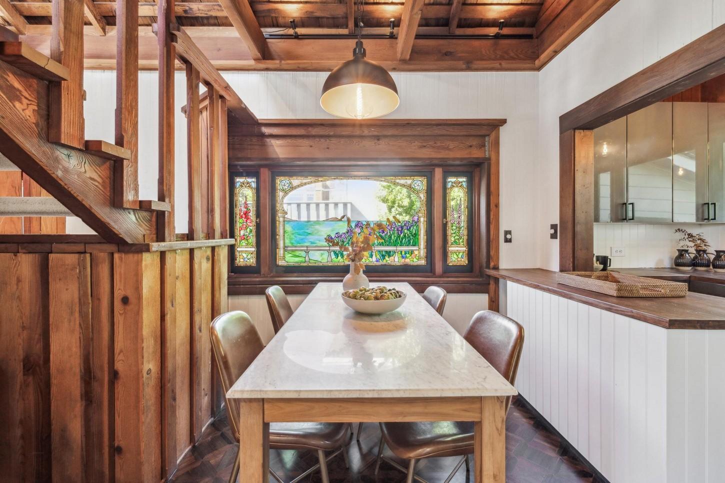 The dining area is surrounded my stained glass, gorgeous light fixtures and serves as the heart center to dine.