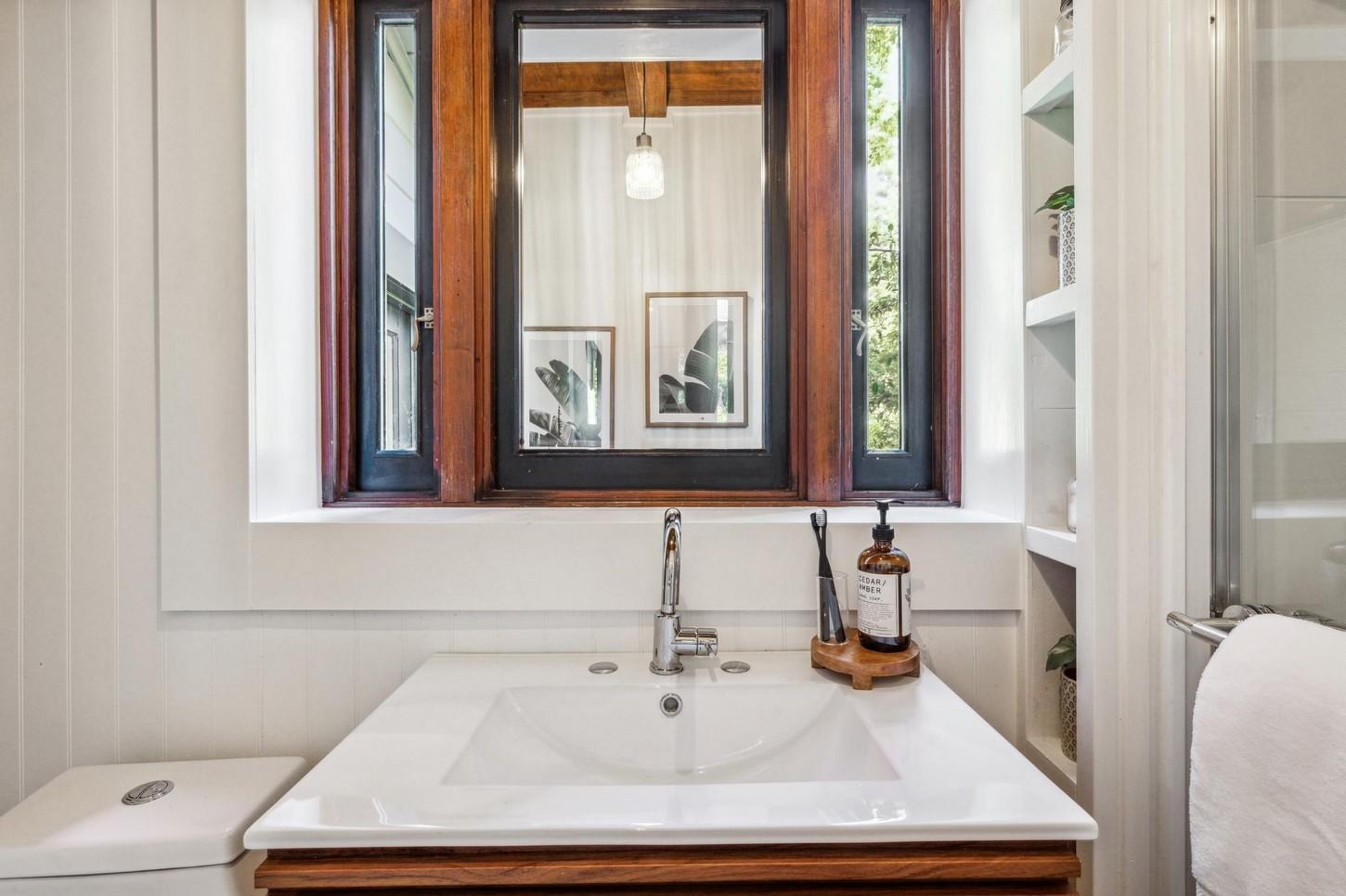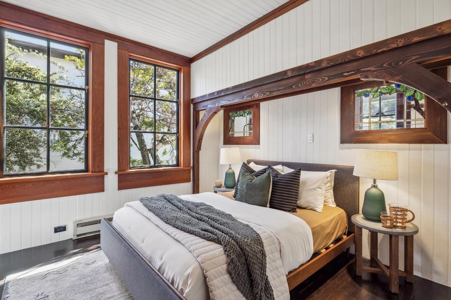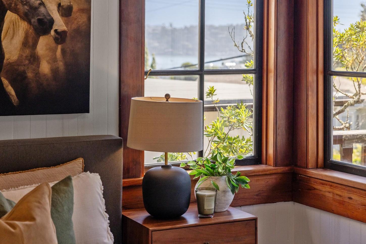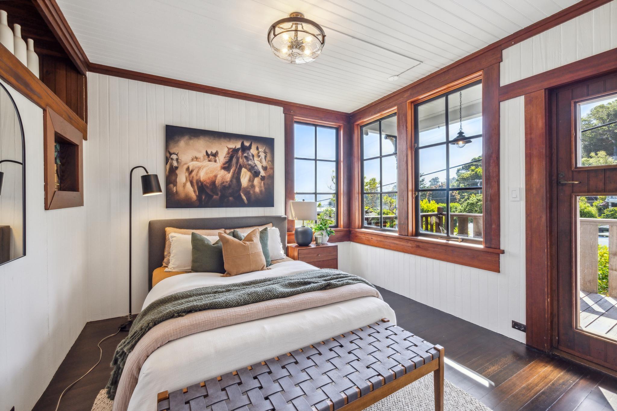 The romantic primary on the main level opens to a private balcony to take in the Bay views.