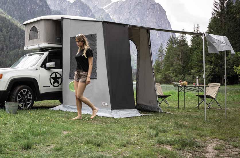 Dotazione di serie: 4 morsetti universali per il ssaggio alle barre portatutto, 2 nestre triangolari con zanzariera e 2 grandi porte con zanzariera, 1 materasso con 2-3-4 cuscini, 2 tasche interne, 2 paletti regolabili per il dispiegamento della zona appendice, 2 paletti per trasformare il portellone posteriore in tendalino, 1 capottina copritenda, rivestimento anticondensa sui paletti del tetto, 2 lacci antivento inseriti nella struttura, ganci appenditutto, predisposizione per l’aggancio della cabina giorno, 1 scaletta regolabile in altezza. Tutti i modelli sono predisposti per il montaggio standard. A richiesta predisposizione per montaggio Explorer.